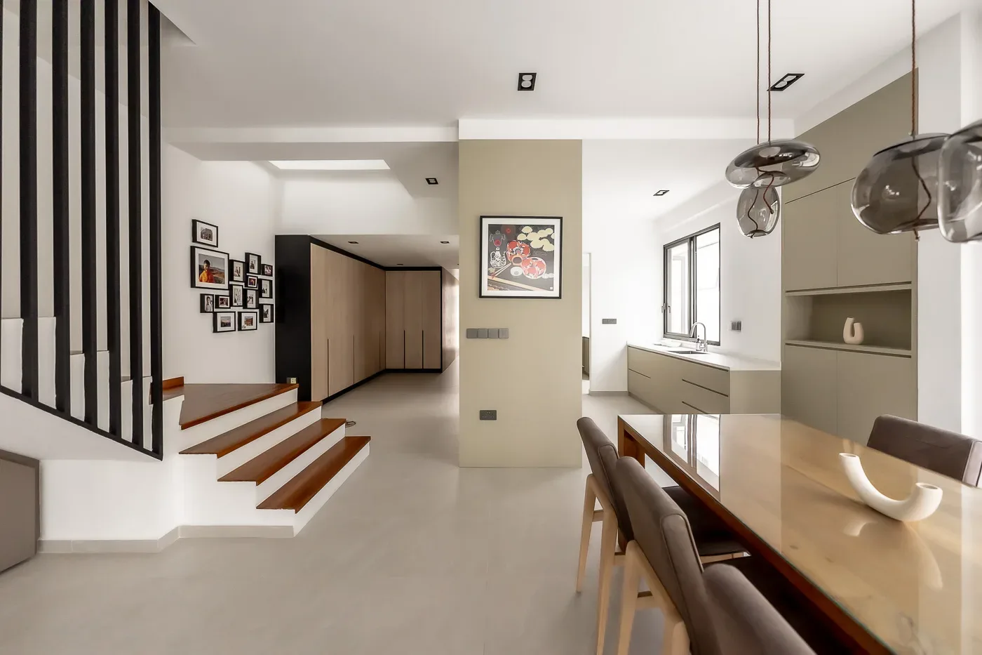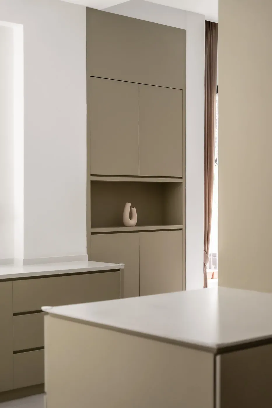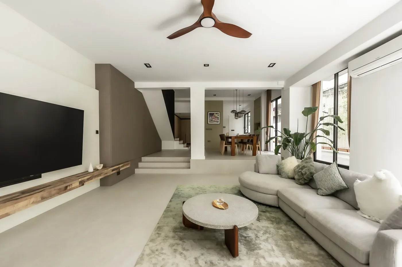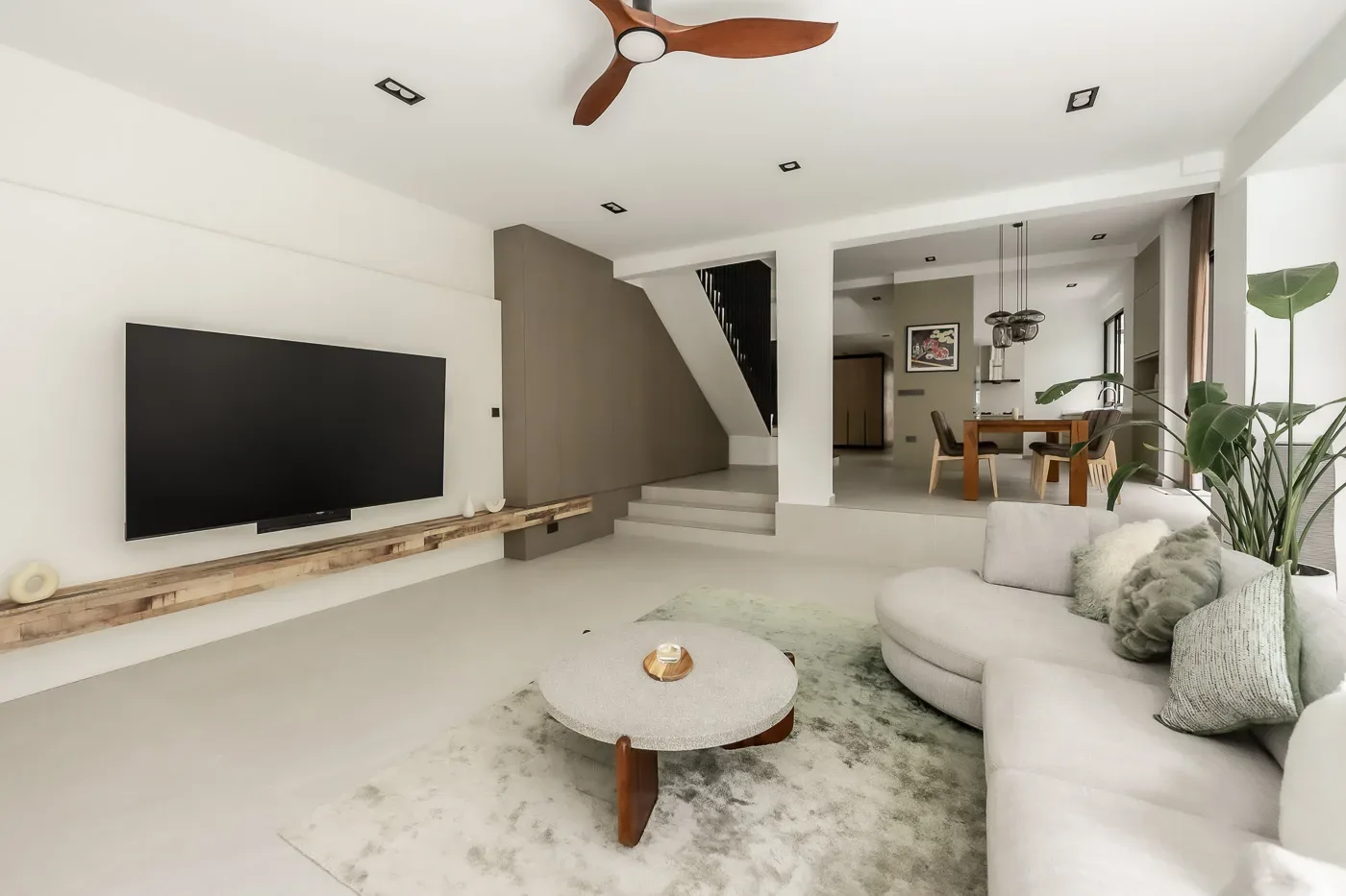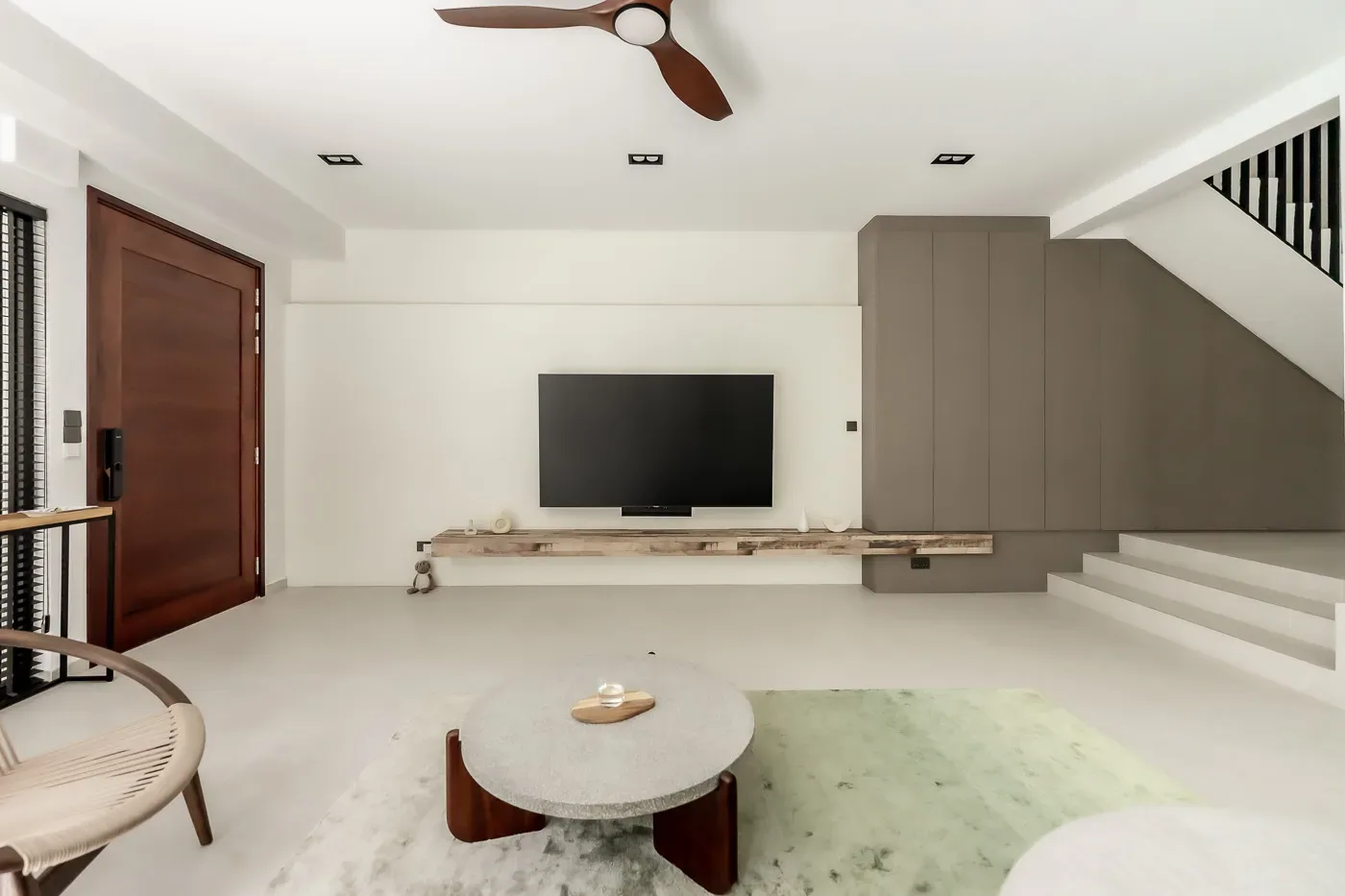 Unique features | A standout feature of this project is the integration of natural elements throughout the living space, which is central to the Urban Zen Minimalism concept. This is showcased by the use of organic materials, such as the reclaimed wood feature wall that elegantly houses the entertainment system, and the natural stone coffee table that anchors the living room. These elements bring an earthy, grounded feel to the modern environment. Furthermore, the strategic placement of greenery in areas of natural light fosters a connection with nature, enhancing the Zen-like atmosphere. The careful blending of minimalist furniture with functional design, such as the streamlined cabinetry and the sleek, modern kitchen, ensures that every element serves a purpose while contributing to the overall aesthetic. The emphasis on clean lines and uncluttered spaces not only provides visual relief but also facilitates ease of movement, reflecting a mindful approach to modern living. Overall, this design project offers a unique sanctuary that balances urban sophistication with the simplicity and introspection of Zen, ideal for those seeking a peaceful haven in the heart of the city. |