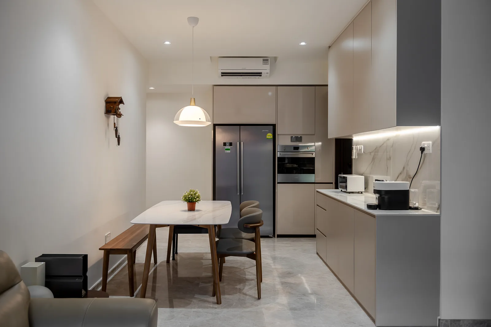 Unique features | Integrated Kitchen & Dining Zone: Flush cabinetry with handle-less finishes and integrated appliances streamline the kitchen profile, while a custom dining setup — featuring a curved-edge stone table and mixed seating — blends casual elegance with practicality. Ambient Lighting Strategy: Cove lighting in the master bedroom headboard, under-cabinet strip lights in the kitchen, and directional spotlights in the living area create layers of light that shift with mood and time of day. Custom Storage Solutions: Bespoke carpentry in the living room and bedrooms provides generous concealed storage, maintaining visual cleanliness while ensuring everyday usability. Textural Balance: The thoughtful interplay of matte laminates, marble veining, plush fabrics, and fluted wall details adds depth without overwhelming the visual field. Versatile Personal Zones: Study and kids’ rooms are personalized with built-in desks, open shelving, and playful color accents — carefully designed to evolve with the family's needs. Frameless Vanity Design: The bedroom vanity features an integrated mirror with vertical light strips, paired with clean-lined cabinetry, emphasizing simplicity and function. |
