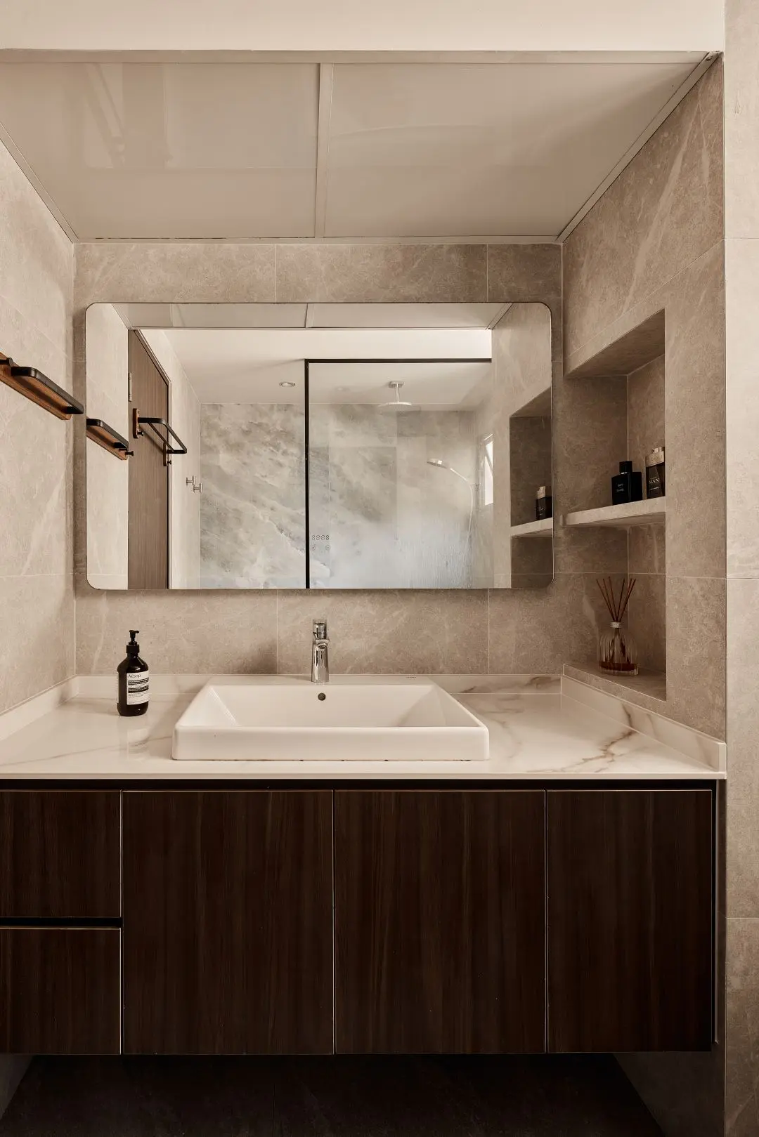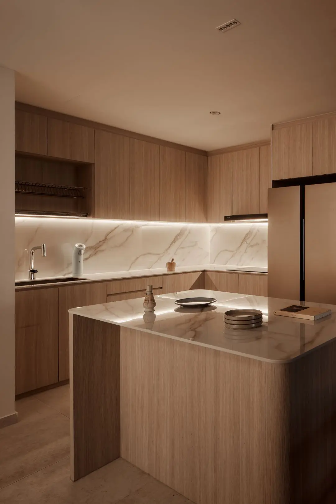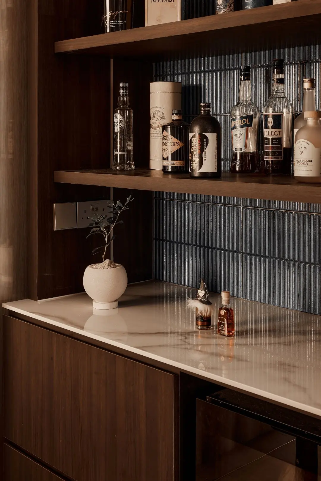 Unique features | Curated Material Harmony: A rich combination of dark walnut veneer and light marble surfaces establishes a luxurious yet soothing aesthetic that feels timeless. Architectural Lighting: Concealed LED accents highlight built-in niches and bar displays, creating depth and warmth without overwhelming the space. Custom Cabinetry Detailing: Bespoke storage units with integrated handles and slatted panels maximize functionality while maintaining a seamless façade. Modern Bar Niche: A statement arched bar display framed in wood and ribbed glass becomes the focal point, merging craftsmanship with ambient mood lighting. Spa-Inspired Bathroom: The bathroom design pairs stone-textured tiles with clean, contemporary fixtures — achieving understated sophistication and balance. |