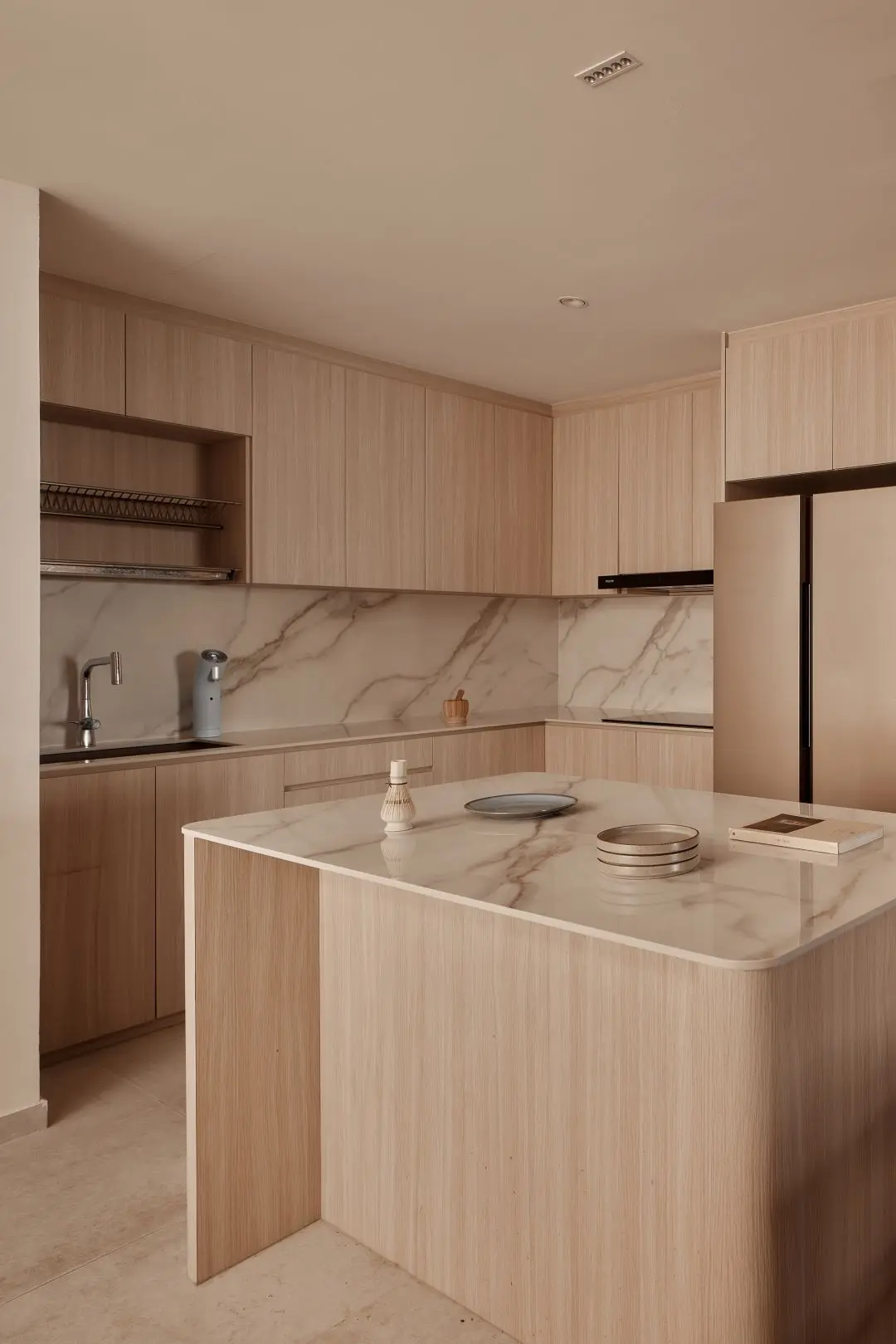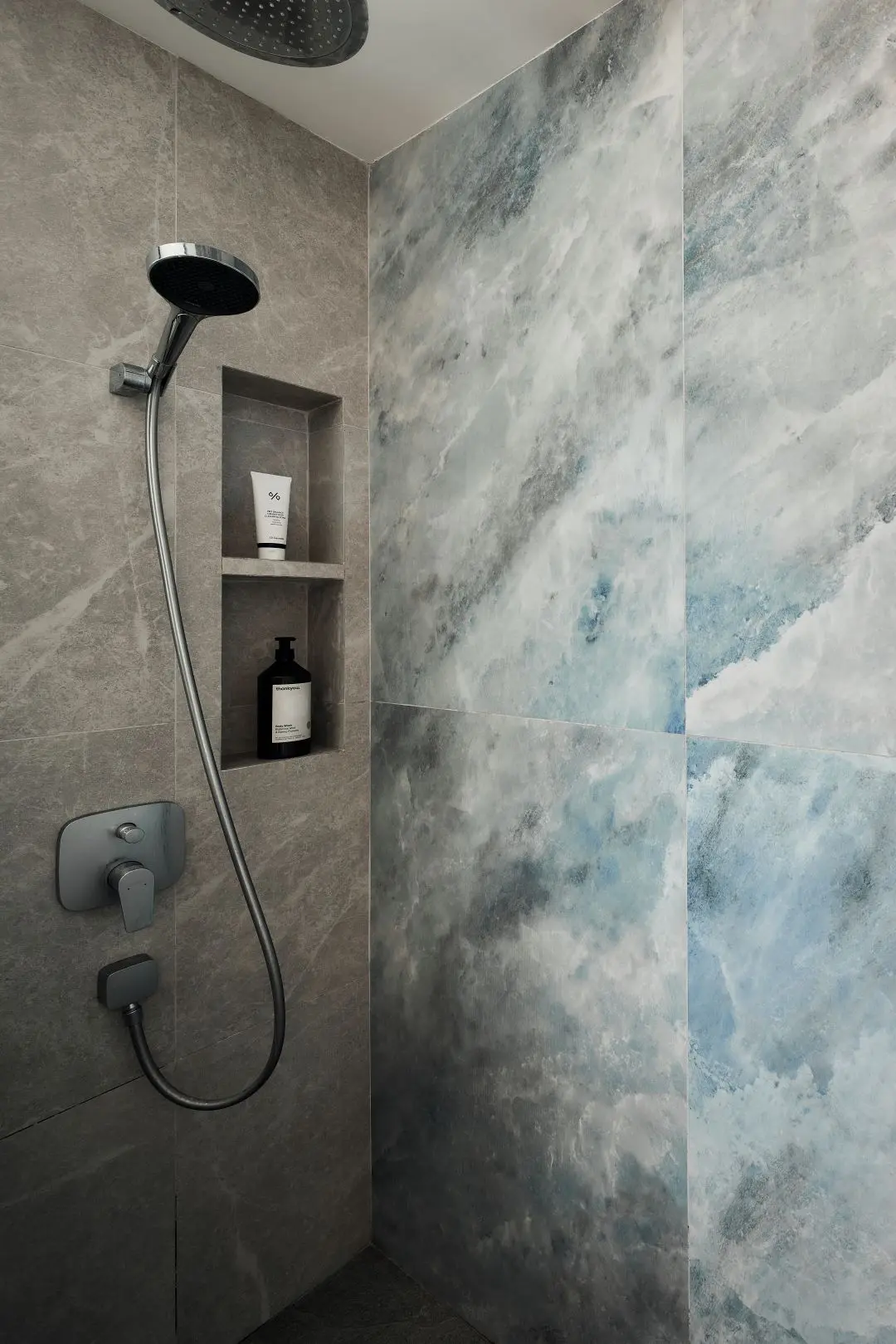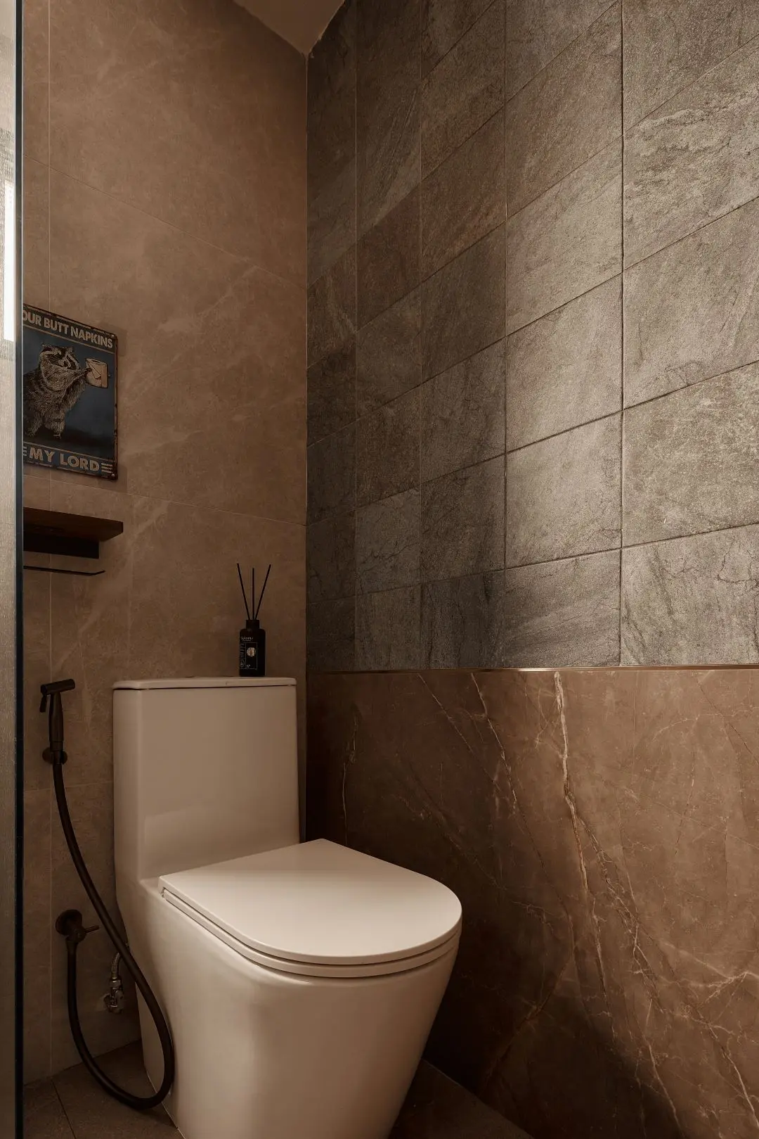 Unique features | Curated Material Harmony: A rich combination of dark walnut veneer and light marble surfaces establishes a luxurious yet soothing aesthetic that feels timeless. Architectural Lighting: Concealed LED accents highlight built-in niches and bar displays, creating depth and warmth without overwhelming the space. Custom Cabinetry Detailing: Bespoke storage units with integrated handles and slatted panels maximize functionality while maintaining a seamless façade. Modern Bar Niche: A statement arched bar display framed in wood and ribbed glass becomes the focal point, merging craftsmanship with ambient mood lighting. Spa-Inspired Bathroom: The bathroom design pairs stone-textured tiles with clean, contemporary fixtures — achieving understated sophistication and balance. |