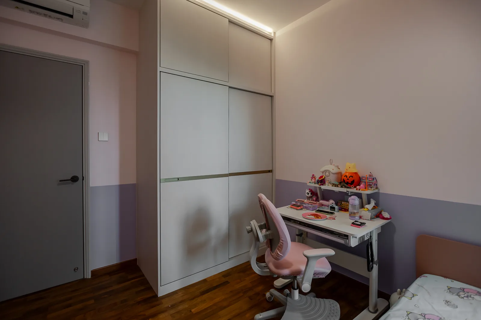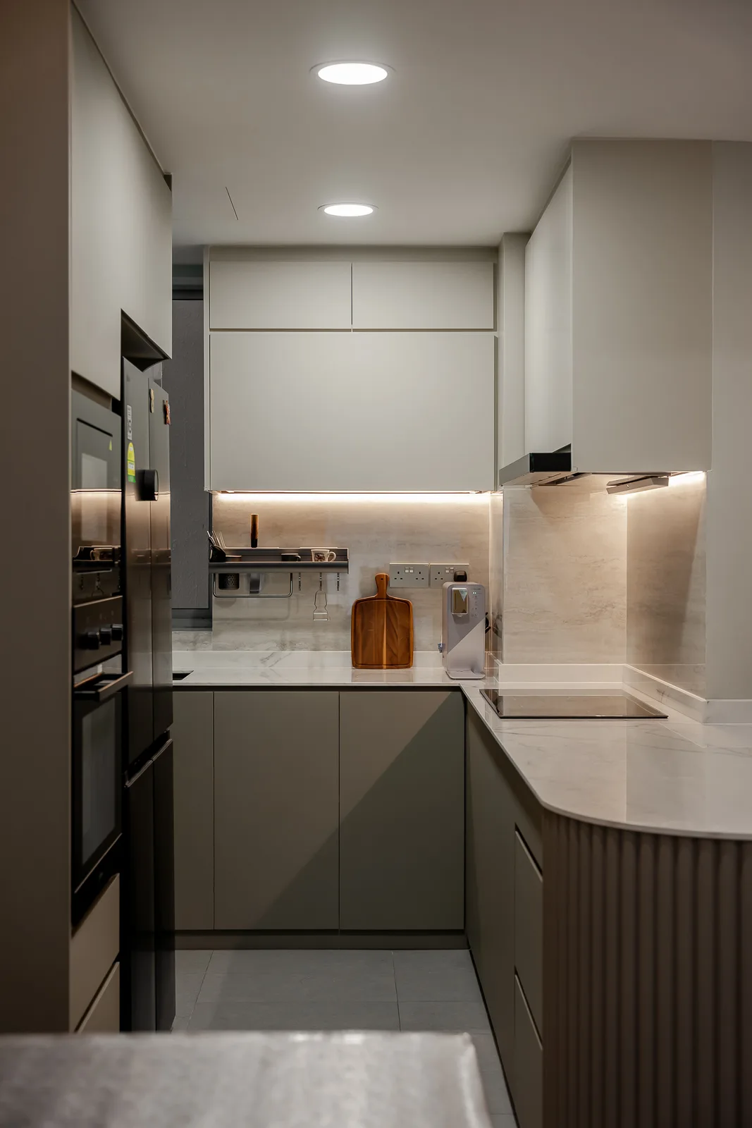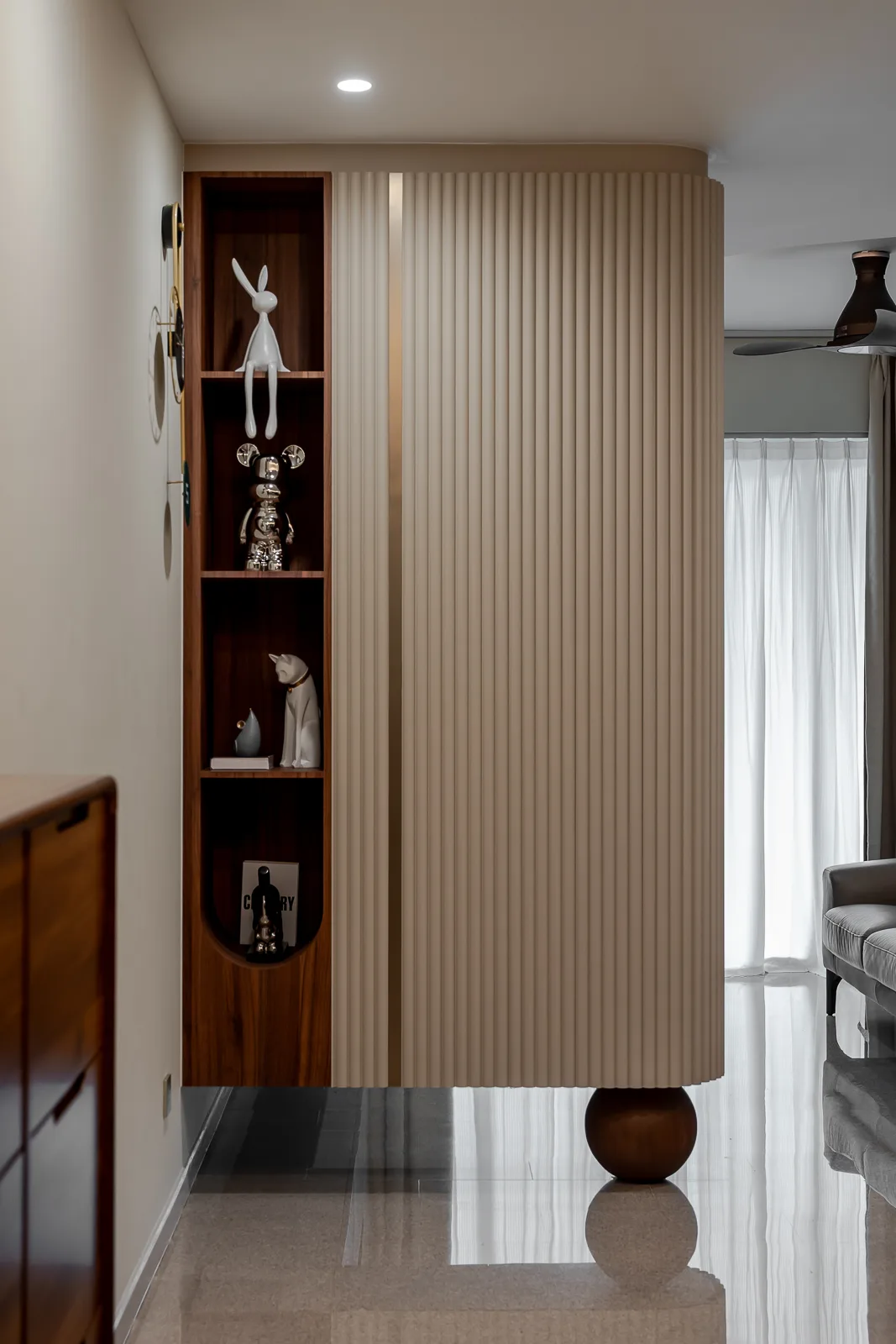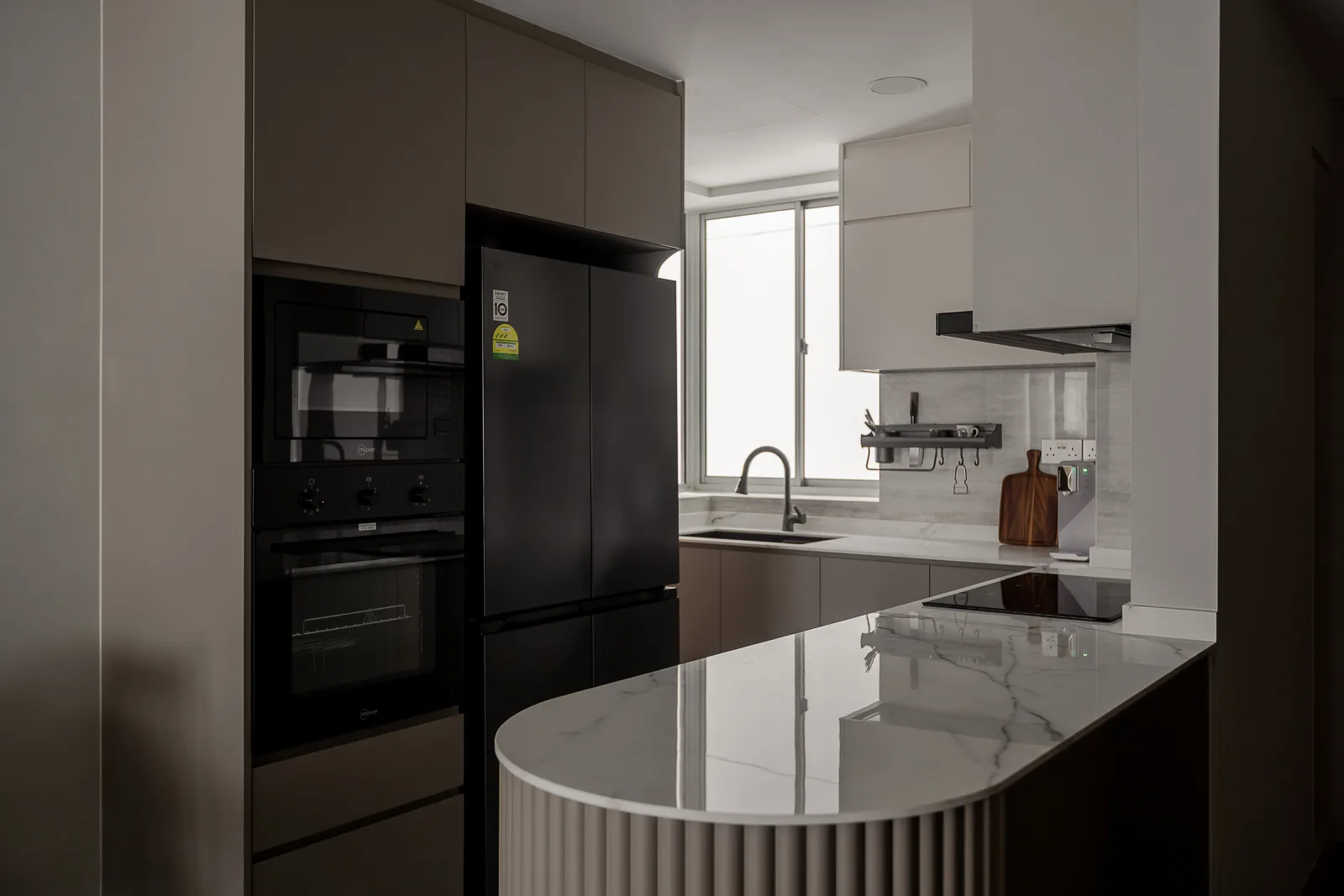 Unique features | Wave-Contour Ceiling: The living room ceiling is reimagined with a custom sculpted cove that sweeps gently across the space, paired with concealed lighting for a subtle, cloud-like ambiance. Bespoke TV Wall: A full-height feature wall combines matte panels, warm walnut niches, and display cabinetry with brass framing — merging utility with gallery-like presentation. Curved Kitchen Island: The highlight of the open-concept kitchen is a marble-look island with fluted paneling and soft edges, offering both visual softness and ergonomic flow. Hidden Vanity Wardrobe: A clever concealed vanity integrated into the wardrobe, complete with internal lighting and mirrored panels, reflects thoughtful spatial maximization for daily rituals. Personalised Kids’ Room: Gentle lilac tones and a study-cum-play corner cater to a growing child’s world — playful yet refined, with ample built-in storage for evolving needs. Hotel-Inspired Bathroom: Vertical subway tiles, black hardware, and a floating vanity bring modern boutique hotel vibes into the home’s private sanctuary. |