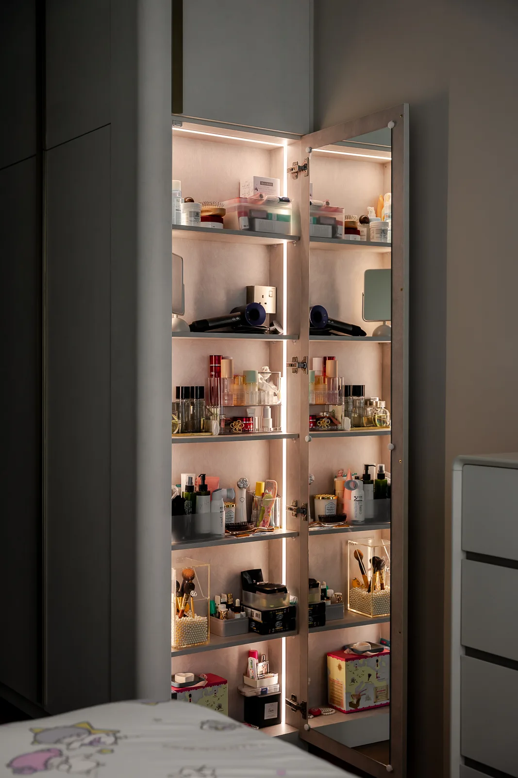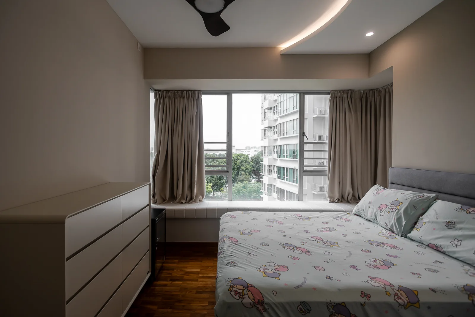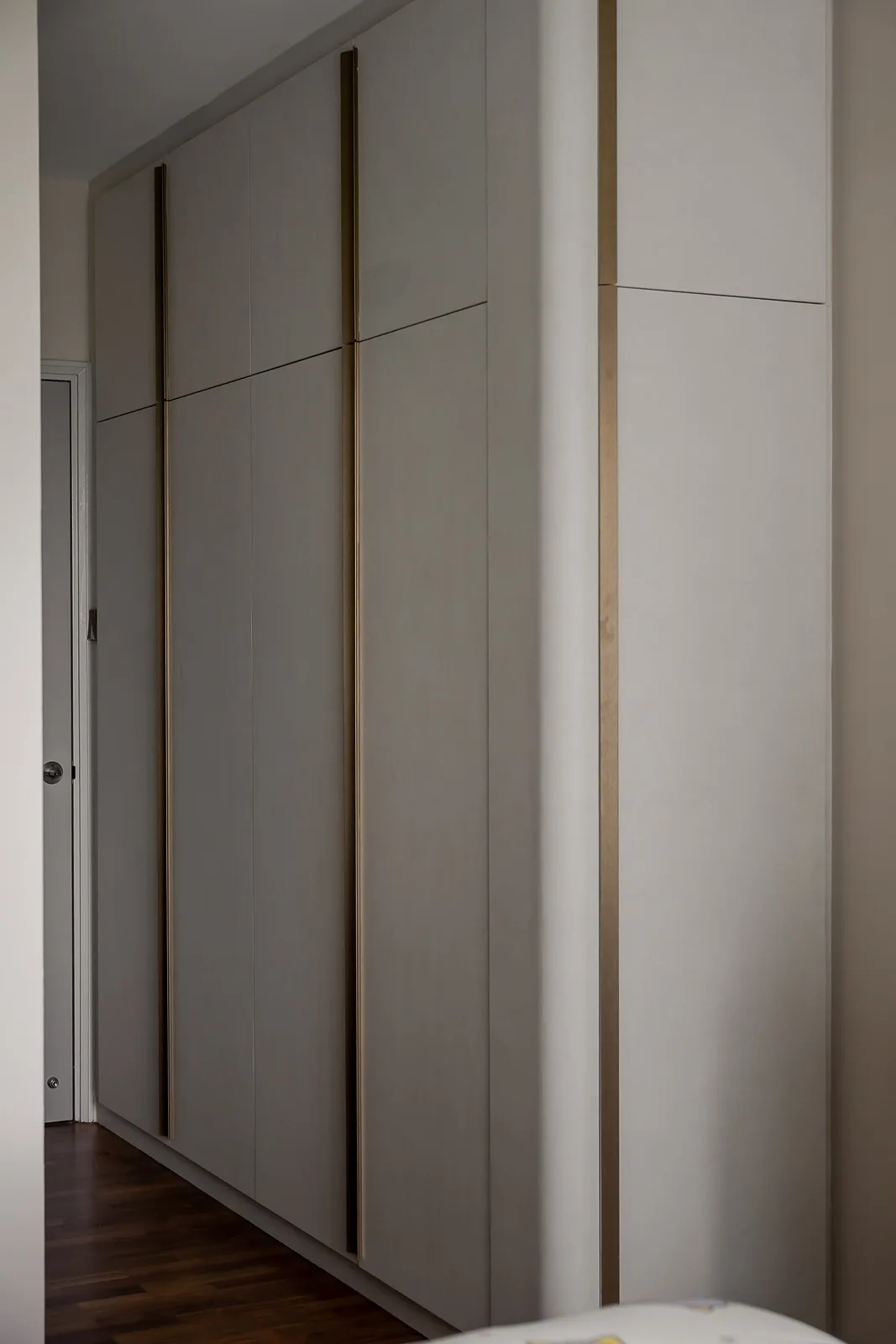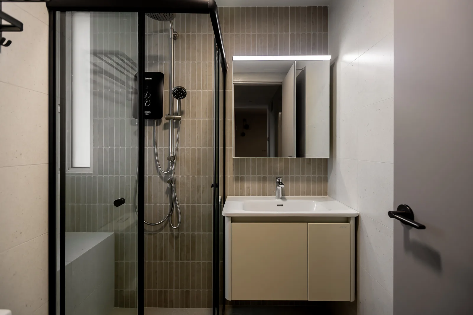 Design Concept | Wave-Contour Ceiling: The living room ceiling is reimagined with a custom sculpted cove that sweeps gently across the space, paired with concealed lighting for a subtle, cloud-like ambiance. Bespoke TV Wall: A full-height feature wall combines matte panels, warm walnut niches, and display cabinetry with brass framing — merging utility with gallery-like presentation. Curved Kitchen Island: The highlight of the open-concept kitchen is a marble-look island with fluted paneling and soft edges, offering both visual softness and ergonomic flow. Hidden Vanity Wardrobe: A clever concealed vanity integrated into the wardrobe, complete with internal lighting and mirrored panels, reflects thoughtful spatial maximization for daily rituals. Personalised Kids’ Room: Gentle lilac tones and a study-cum-play corner cater to a growing child’s world — playful yet refined, with ample built-in storage for evolving needs. Hotel-Inspired Bathroom: Vertical subway tiles, black hardware, and a floating vanity bring modern boutique hotel vibes into the home’s private sanctuary. |
