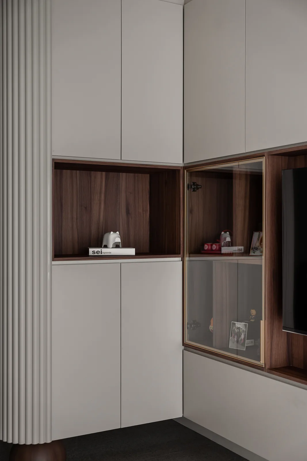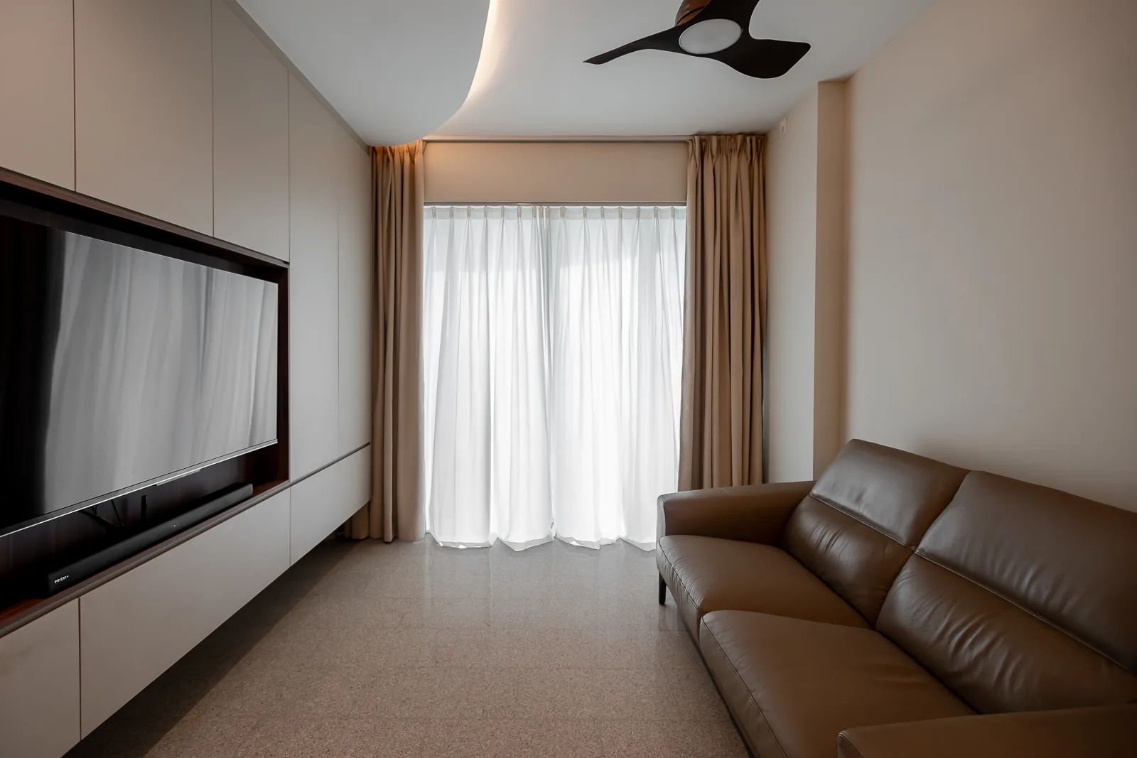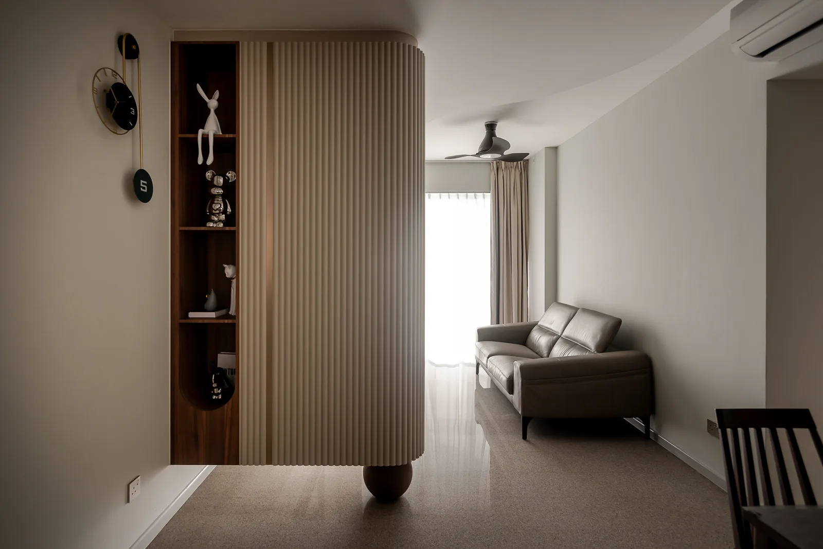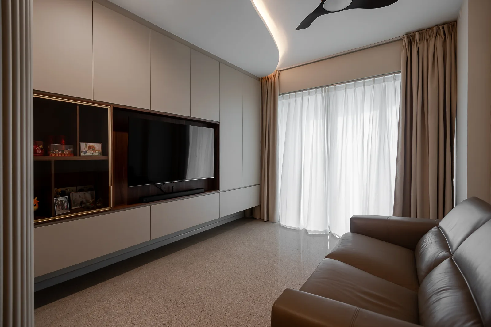 Design Concept | Wave-Contour Ceiling: The living room ceiling is reimagined with a custom sculpted cove that sweeps gently across the space, paired with concealed lighting for a subtle, cloud-like ambiance. Bespoke TV Wall: A full-height feature wall combines matte panels, warm walnut niches, and display cabinetry with brass framing — merging utility with gallery-like presentation. Curved Kitchen Island: The highlight of the open-concept kitchen is a marble-look island with fluted paneling and soft edges, offering both visual softness and ergonomic flow. Hidden Vanity Wardrobe: A clever concealed vanity integrated into the wardrobe, complete with internal lighting and mirrored panels, reflects thoughtful spatial maximization for daily rituals. Personalised Kids’ Room: Gentle lilac tones and a study-cum-play corner cater to a growing child’s world — playful yet refined, with ample built-in storage for evolving needs. Hotel-Inspired Bathroom: Vertical subway tiles, black hardware, and a floating vanity bring modern boutique hotel vibes into the home’s private sanctuary. |