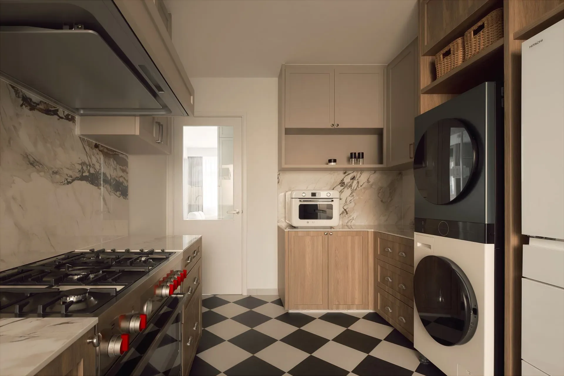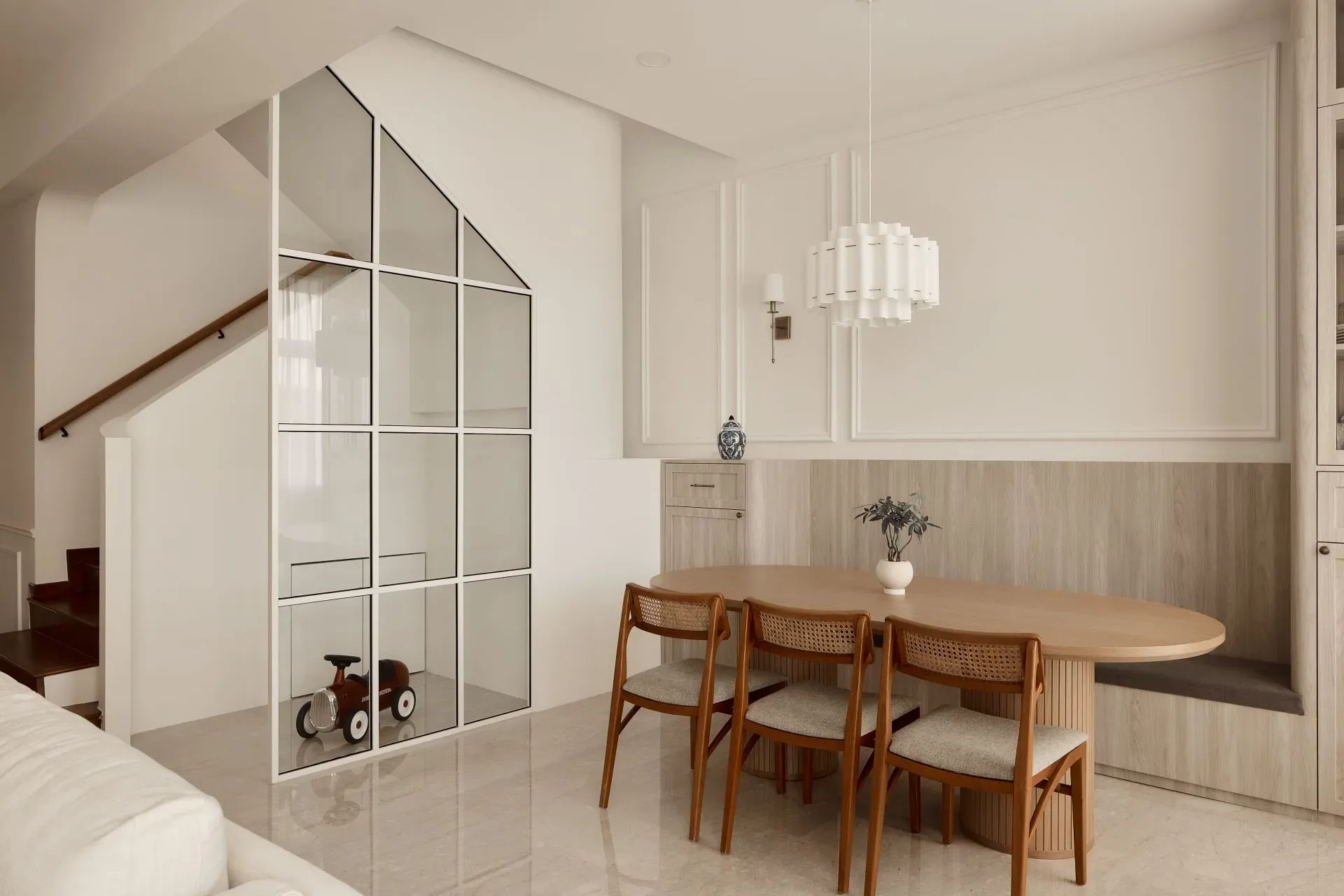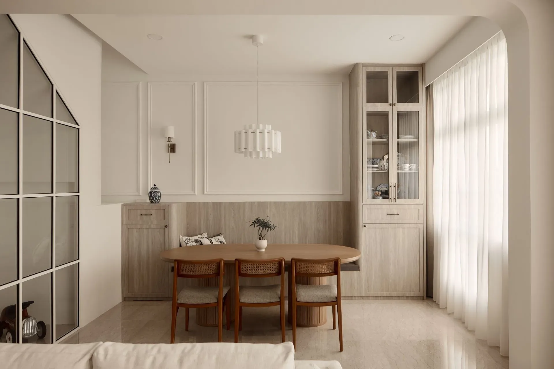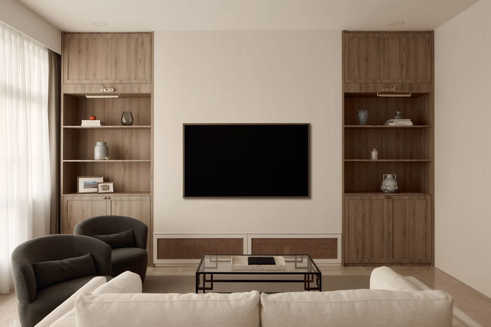 | Unique features | Integrated Living and Display Elements The living area is anchored by a custom feature wall combining open shelving, concealed storage, and textured paneling. This balanced composition creates a focal point while maintaining a sense of lightness and visual harmony. Modern Classic Spatial Language Wall moldings, soft panel details, and warm timber finishes introduce a contemporary interpretation of classic interior elements, adding depth without overwhelming the space. Architectural Storage Solutions Full-height cabinetry is carefully integrated across the residence, transforming storage into part of the architectural expression. Features such as the arched niche at the entry introduce subtle character while maintaining functional intent. Personalised Private Spaces Bedrooms and study areas adopt softer colour palettes and tailored carpentry solutions, creating environments that respond to individual needs while remaining consistent with the overall design language. Refined Kitchen Composition The kitchen balances practicality with elegance through the combination of marble surfaces, warm wood cabinetry, and patterned flooring. Integrated lighting enhances material textures while improving functionality for everyday use. Layered Lighting Experience Concealed lighting within cabinetry and workspaces adds warmth and depth, allowing the ambience of the home to shift naturally between day and evening. |