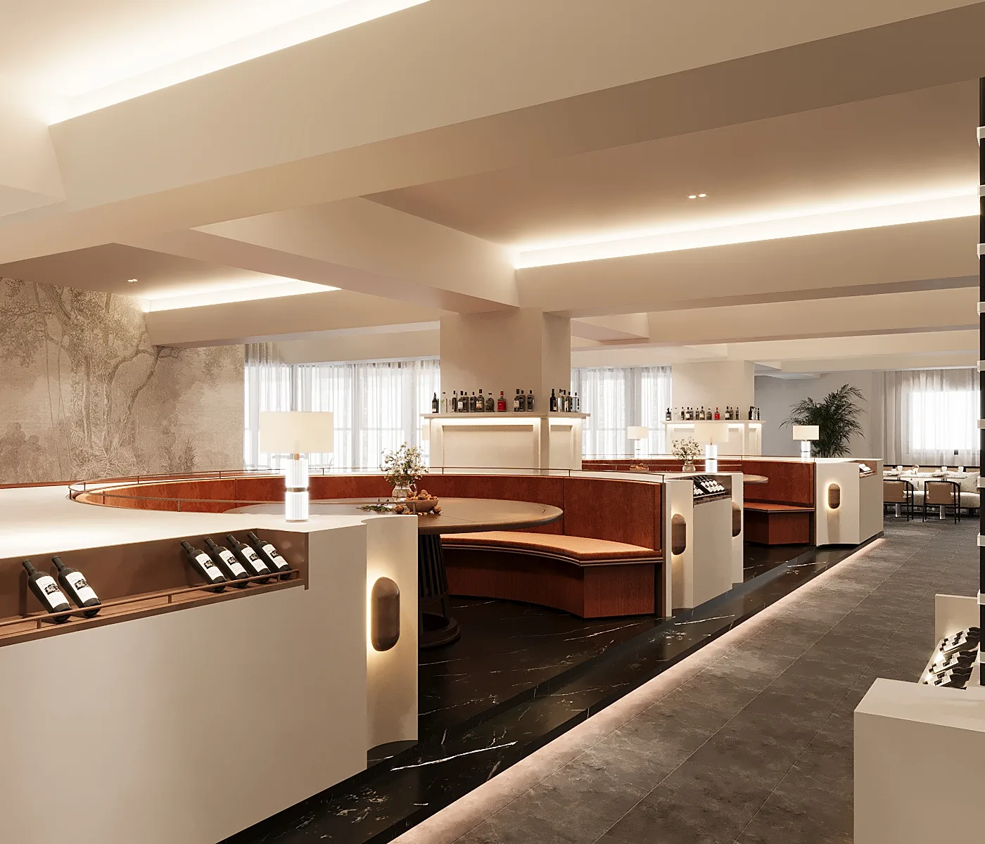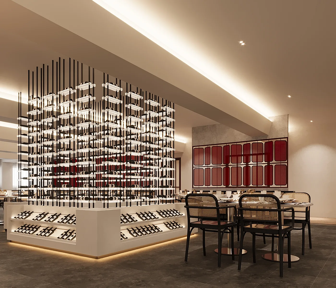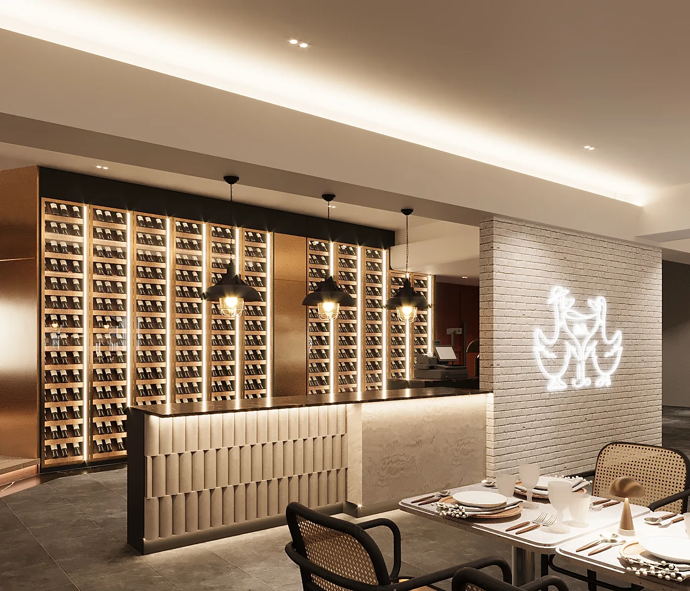 Unique features | Monumental Wine Display Wall: The bar area features a dramatic floor-to-ceiling wine wall, lit with architectural precision to create a sculptural backdrop that draws the eye and defines the space. Curated Booth Seating & Island Displays: Semi-enclosed booths and freestanding bottle displays create intimacy within openness — offering privacy while maintaining visual transparency. Iconic Neon Branding: The restaurant’s identity is anchored by a playful white neon motif, rendered on both brick and curved plaster surfaces — providing cohesion across spaces. Textured Reception & Glass Block Feature: At the foyer, a modern curved bench set against retro-style circular glass blocks introduces texture and light diffusion, setting a serene yet playful tone. Signature Bar Counter: With dark stone finishes, brass arches, and ambient lighting, the bar counter acts as a moody focal point — blending indulgence with craftsmanship. Cigar Lounge & Private Rooms: Tucked behind glass partitions, the cigar room evokes exclusivity with warm wood flooring and ambient forest mural backdrops. Private dining rooms embrace tradition with contemporary panelling, wall sconces, and layered textures that frame every gathering with grace. |