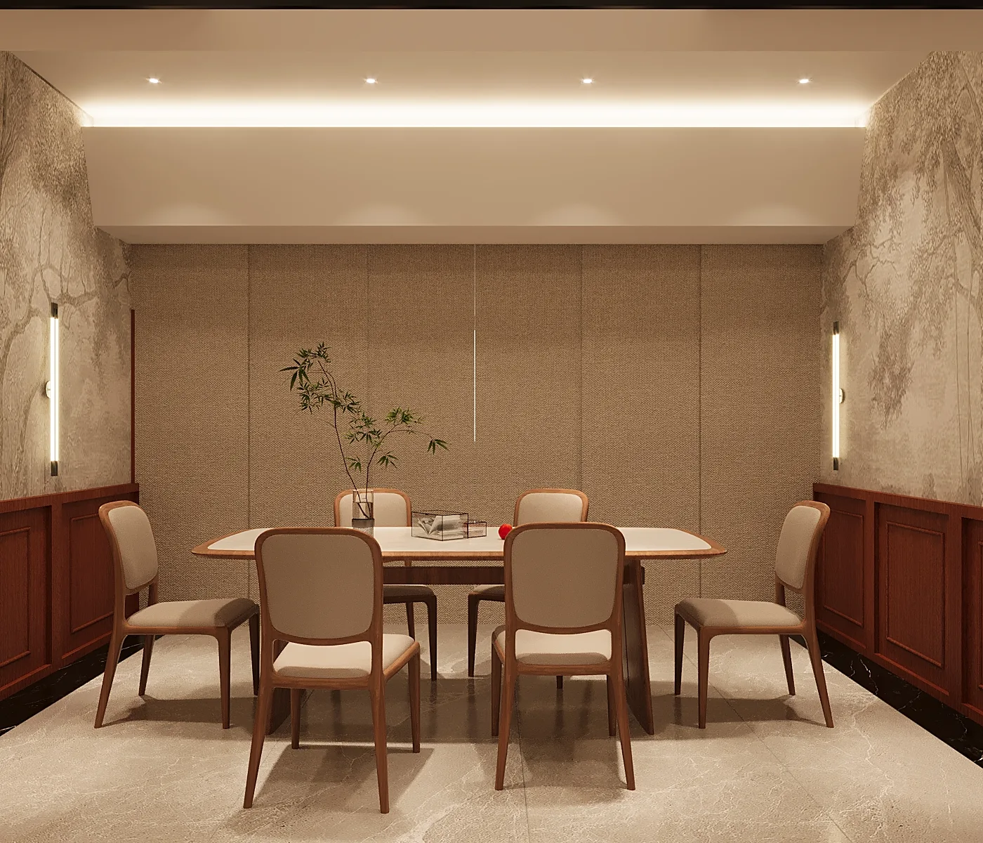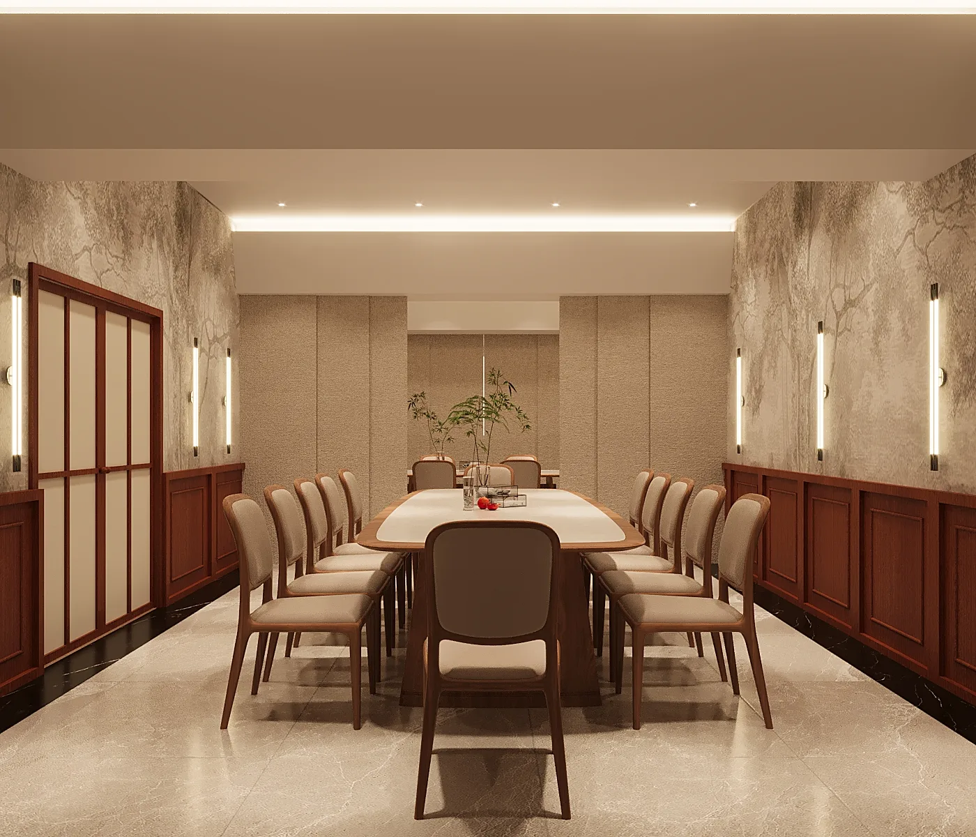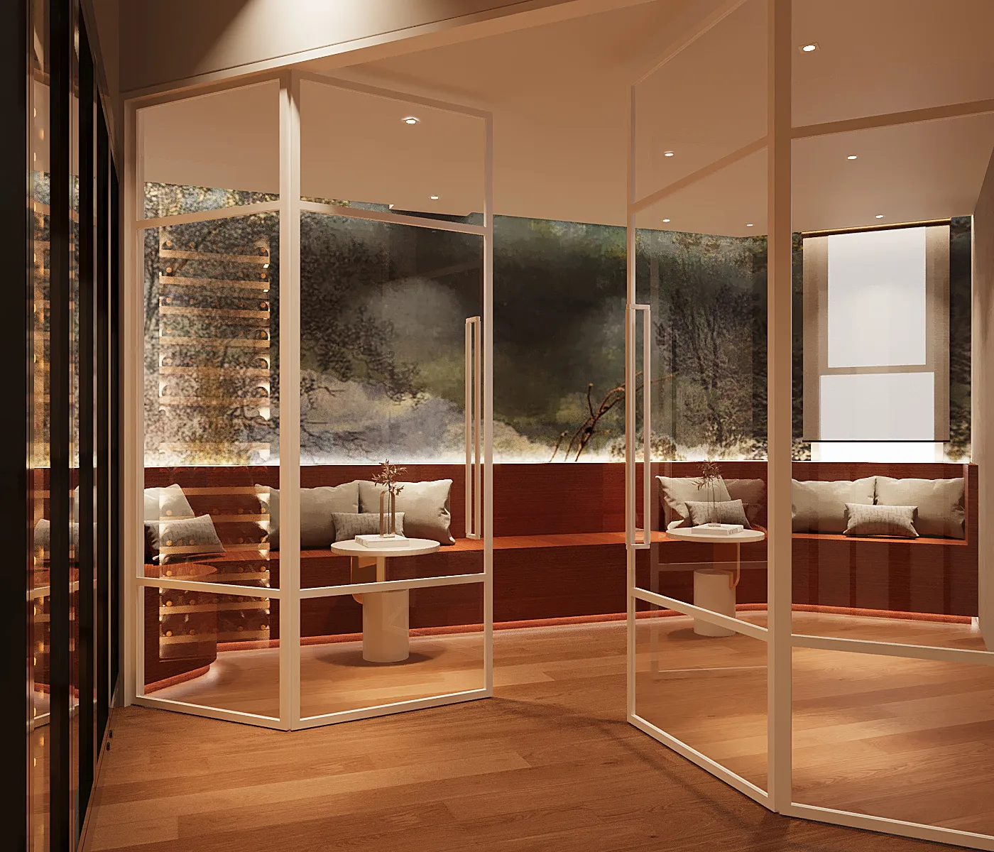 Unique features | Monumental Wine Display Wall: The bar area features a dramatic floor-to-ceiling wine wall, lit with architectural precision to create a sculptural backdrop that draws the eye and defines the space. Curated Booth Seating & Island Displays: Semi-enclosed booths and freestanding bottle displays create intimacy within openness — offering privacy while maintaining visual transparency. Iconic Neon Branding: The restaurant’s identity is anchored by a playful white neon motif, rendered on both brick and curved plaster surfaces — providing cohesion across spaces. Textured Reception & Glass Block Feature: At the foyer, a modern curved bench set against retro-style circular glass blocks introduces texture and light diffusion, setting a serene yet playful tone. Signature Bar Counter: With dark stone finishes, brass arches, and ambient lighting, the bar counter acts as a moody focal point — blending indulgence with craftsmanship. Cigar Lounge & Private Rooms: Tucked behind glass partitions, the cigar room evokes exclusivity with warm wood flooring and ambient forest mural backdrops. Private dining rooms embrace tradition with contemporary panelling, wall sconces, and layered textures that frame every gathering with grace. |
