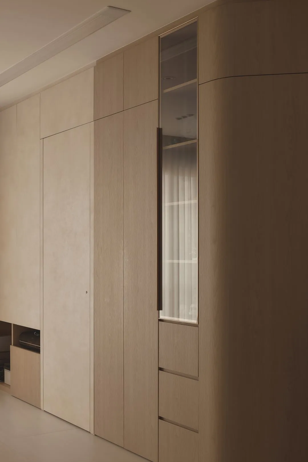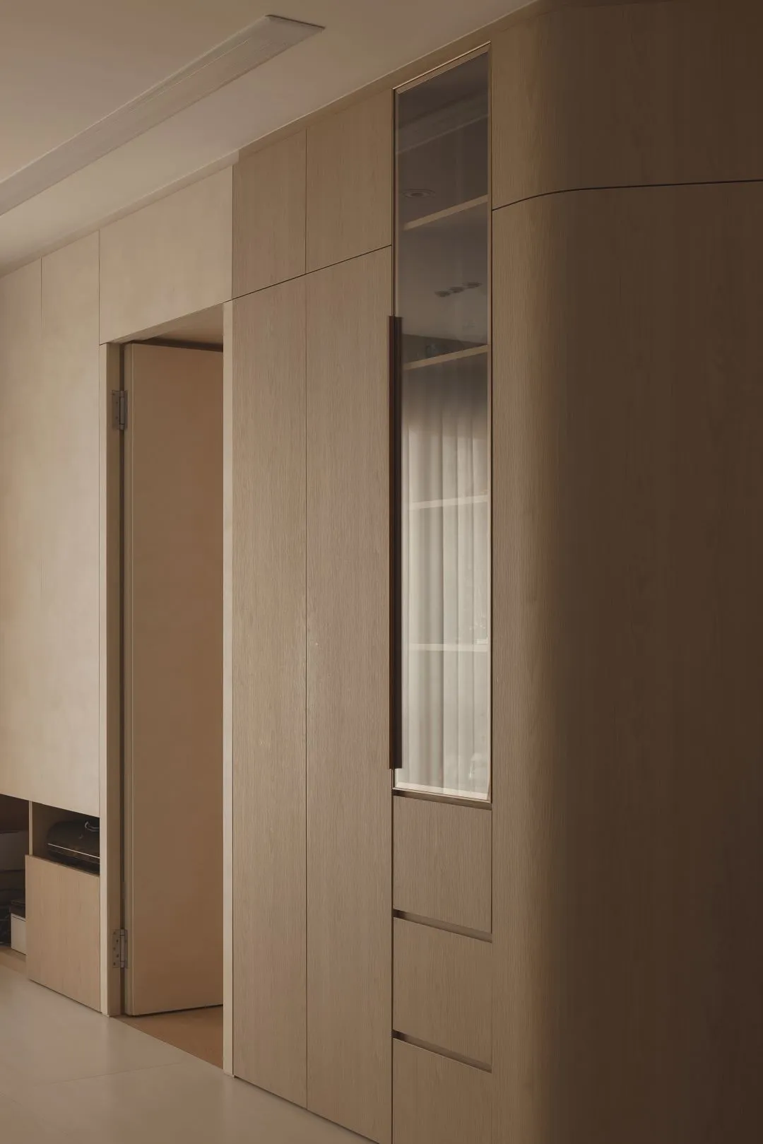 One of the most distinctive signatures of this project is the deliberate introduction of curved edges throughout the full-height oak cabinetry. Rather than the sharp, angular joinery common in contemporary Singapore interior design, the cabinetry at Prinsep Link transitions between walls and panels with gently radiused corners — a subtle but profoundly humanising touch that softens the entire spatial experience.