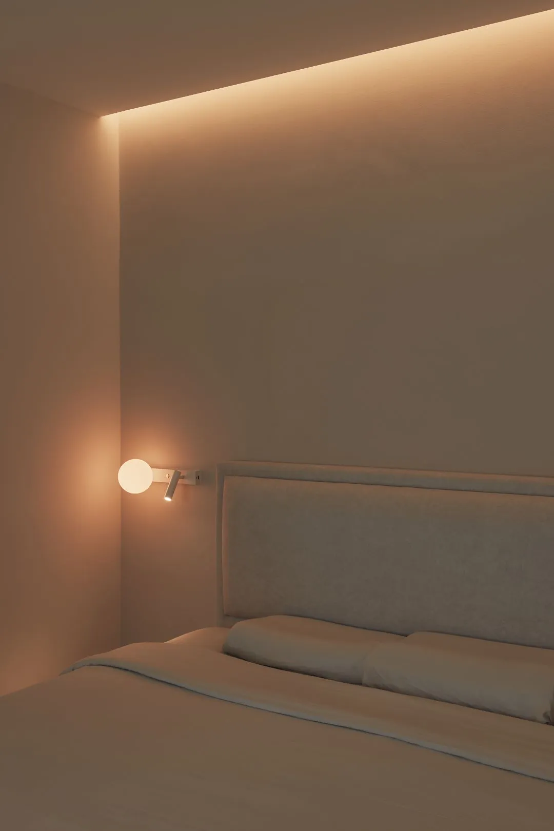 The master bedroom wardrobe is a masterclass in visual restraint. Finished in a warm sand-tone laminate with hairline-thin vertical recessed handles, the full-height configuration maximises storage while disappearing gracefully into the room — its barely-there presence allowing the soft, hotel-like atmosphere of the bedroom to breathe.