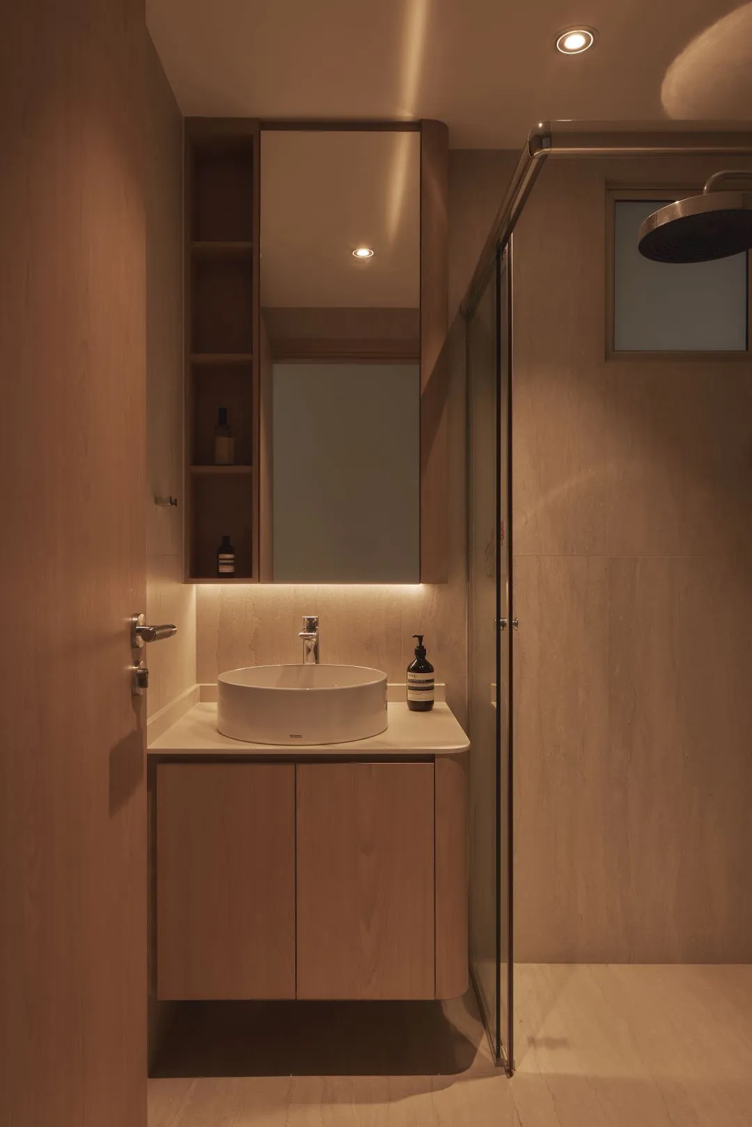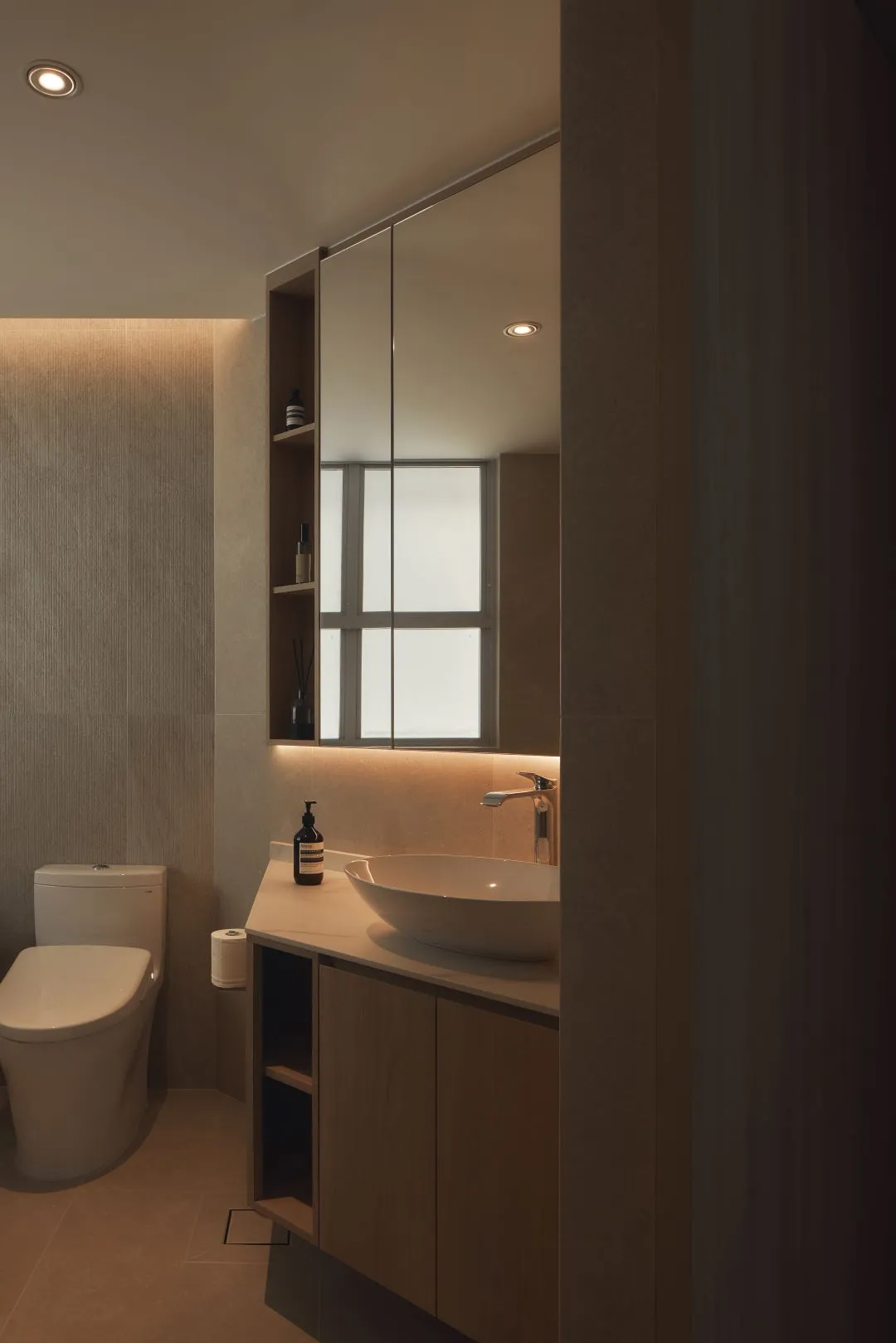 The design concept for Prinsep Link is rooted in what we call Warm Minimalism — a philosophy that rejects cold austerity in favour of spaces that are spare yet deeply inviting. Where conventional minimalism strips back and withholds, this home layers quietly: warm-toned oak against creamy stone, shadow against candlelight-soft illumination, the smooth against the textured.
