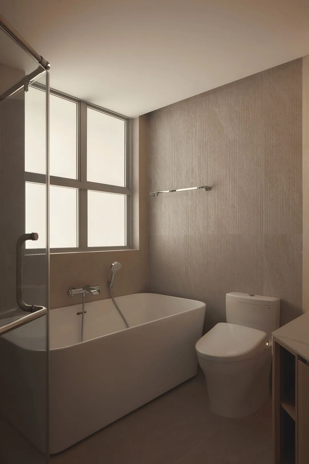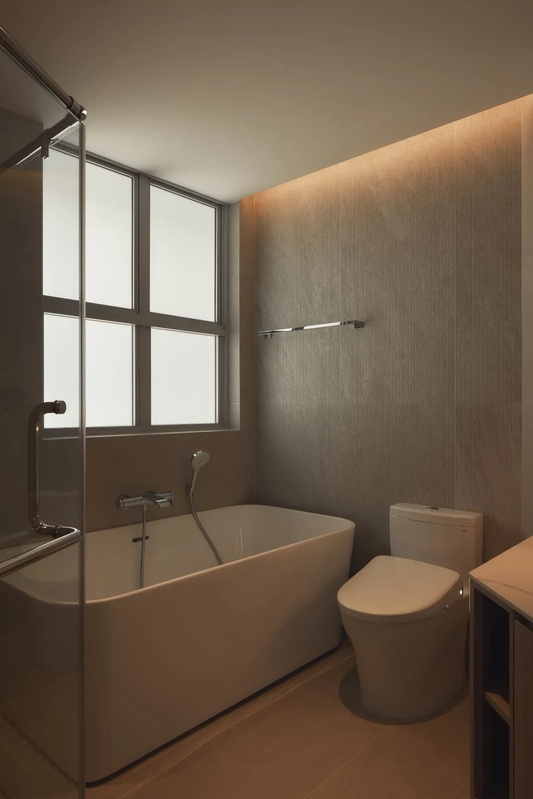 The master bathroom is a private retreat unto itself. A freestanding soaking bathtub positioned before full-height windows invites natural light to fill the space, while textured linen-effect wall tiles add subtle visual warmth. Warm LED cove lighting crowns the room at ceiling level, transforming the bathroom after dark into a space that rivals the world's finest hotel suites.