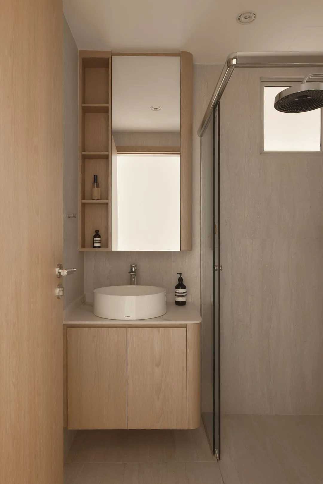Both bathrooms feature round vessel basins mounted on custom oak vanity units — a design decision that unifies the wet spaces with the broader material story of the home. Oak mirror cabinets with integrated open shelving complete each vanity zone, offering practical storage without sacrificing the calm, gallery-like quality of the bathrooms.