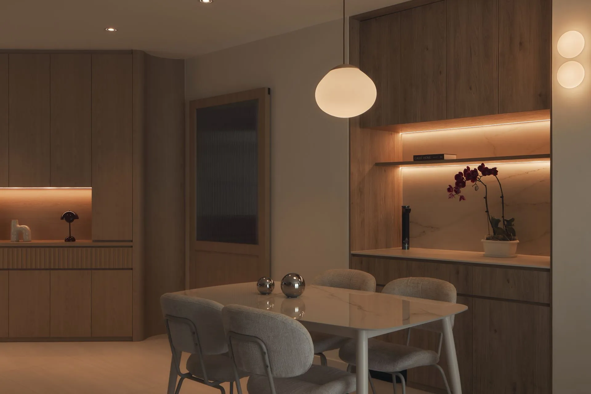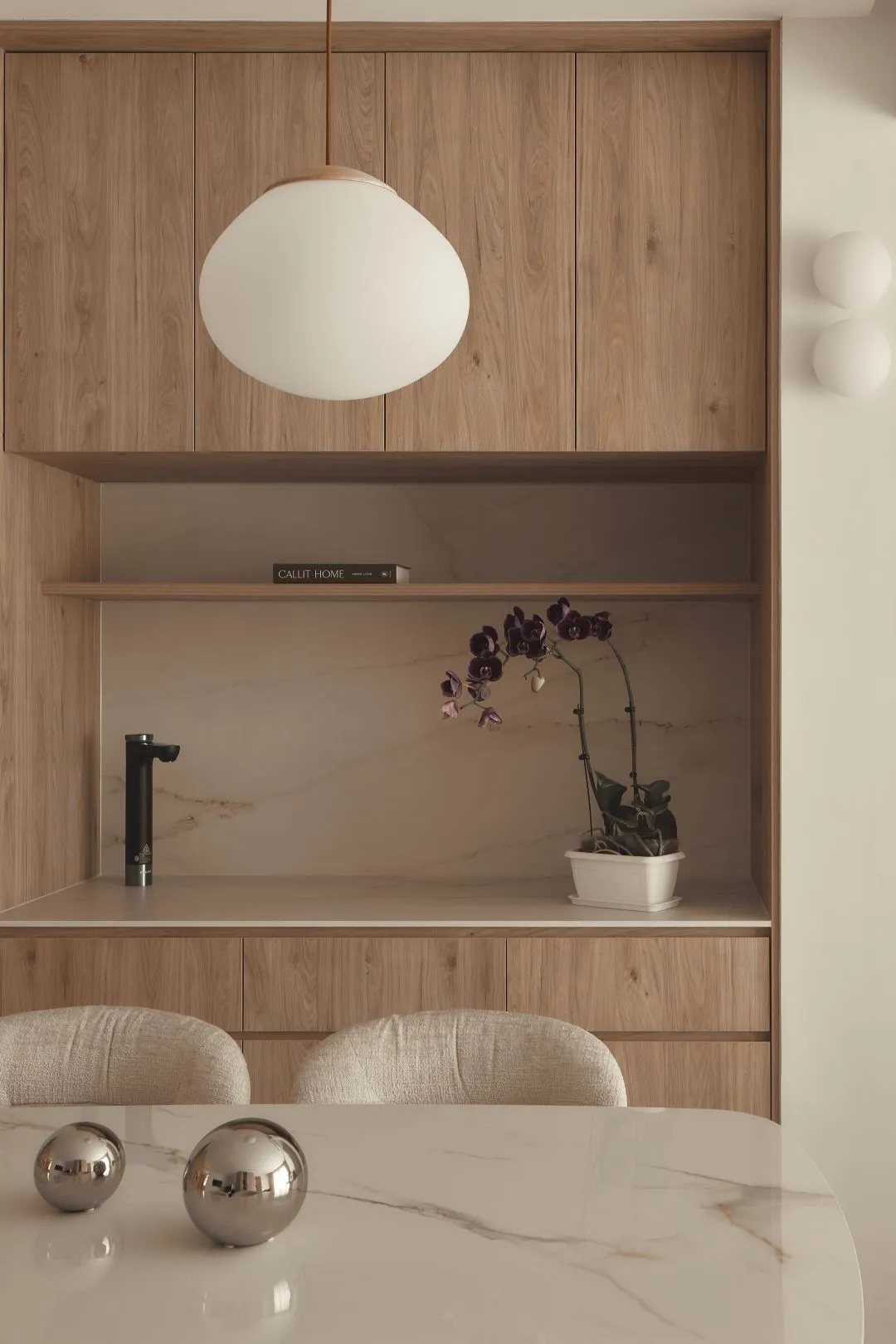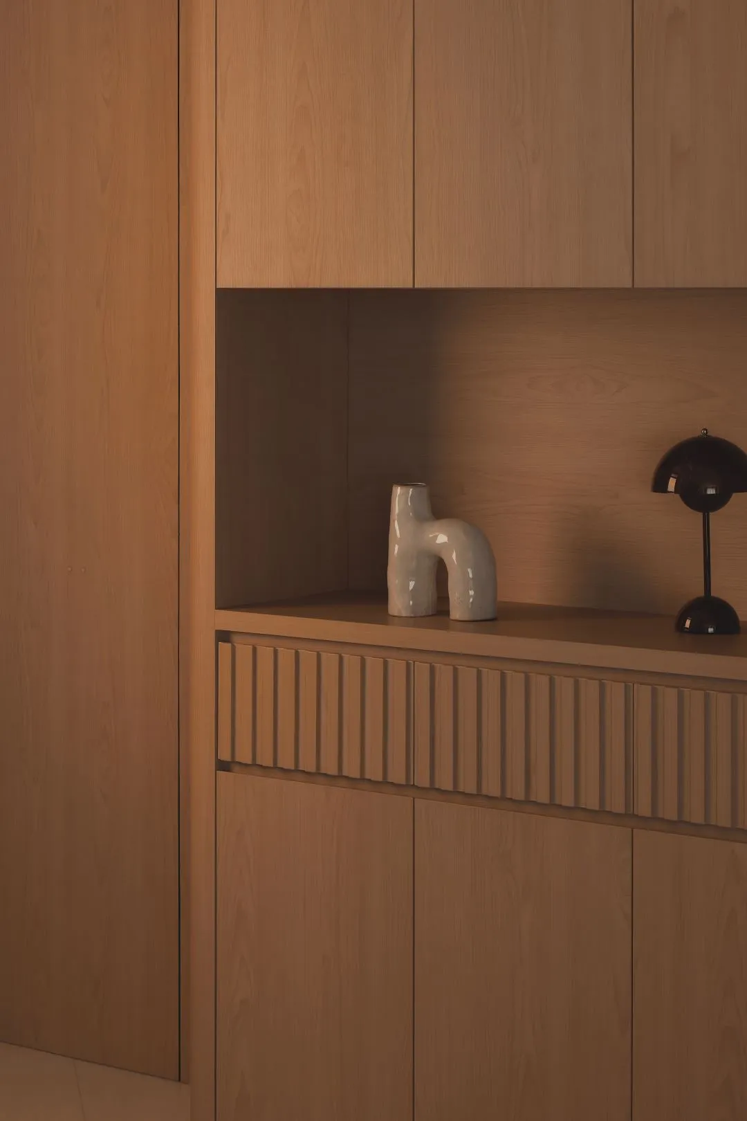 | Unique features | Curved Oak Joinery with Soft-Radius Detailing One of the most distinctive signatures of this project is the deliberate introduction of curved edges throughout the full-height oak cabinetry. Rather than the sharp, angular joinery common in contemporary Singapore interior design, the cabinetry at Prinsep Link transitions between walls and panels with gently radiused corners — a subtle but profoundly humanising touch that softens the entire spatial experience. Dual-Mood Lighting Architecture The home has been meticulously designed to live beautifully in two distinct lighting states. By day, spaces are bright and airy, anchored by natural oak and neutral stone tones. By night, a layered system of warm LED cove lighting, under-shelf strip lights, and sculptural pendant and wall-mounted fixtures transforms the same spaces into something altogether more intimate and enveloping. The dining and bar nook, in particular, shifts dramatically between these two moods — a feature best appreciated in the day-to-night photography of the project. Reeded Glass Pivot Door Framing the transition between the living and dining zones, a custom timber-framed door with reeded glass panel serves as both a functional space divider and a sculptural centrepiece. The vertical ribbing of the glass diffuses light and sight lines beautifully, maintaining a sense of openness while adding visual rhythm and architectural texture to the interior. Fluted Timber Cabinetry Panels Across the living room joinery, fluted vertical detailing is applied to select cabinet faces — a refined material accent that introduces depth and tactility without resorting to excessive ornamentation. This detail echoes the reeded glass of the pivot door, creating a cohesive design language that runs throughout the home. Built-In Dry Bar & Display Niche Integrated seamlessly into the dining room joinery wall, a dedicated dry bar and display niche is framed in matching oak with a travertine-effect stone backsplash. Complete with open shelving for curated objects and a touch-on sensor tap, this feature elevates the dining experience beyond the everyday — making even a quiet weeknight dinner feel considered and special. Floor-to-Ceiling Sand-Tone Wardrobe The master bedroom wardrobe is a masterclass in visual restraint. Finished in a warm sand-tone laminate with hairline-thin vertical recessed handles, the full-height configuration maximises storage while disappearing gracefully into the room — its barely-there presence allowing the soft, hotel-like atmosphere of the bedroom to breathe. Spa-Inspired Master Bathroom with Soaking Tub The master bathroom is a private retreat unto itself. A freestanding soaking bathtub positioned before full-height windows invites natural light to fill the space, while textured linen-effect wall tiles add subtle visual warmth. Warm LED cove lighting crowns the room at ceiling level, transforming the bathroom after dark into a space that rivals the world's finest hotel suites. Consistent Vessel Basin + Oak Vanity Language Both bathrooms feature round vessel basins mounted on custom oak vanity units — a design decision that unifies the wet spaces with the broader material story of the home. Oak mirror cabinets with integrated open shelving complete each vanity zone, offering practical storage without sacrificing the calm, gallery-like quality of the bathrooms. |