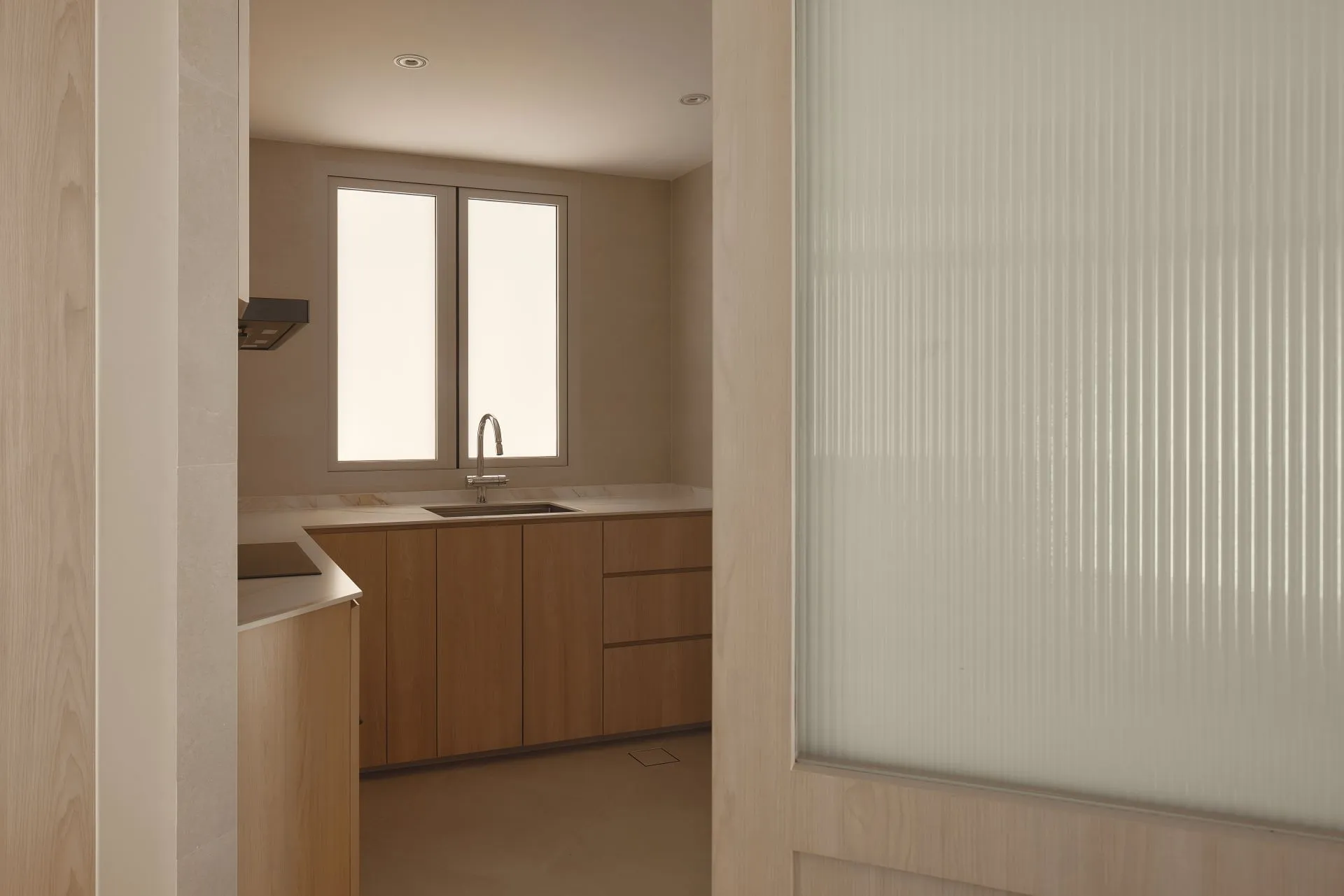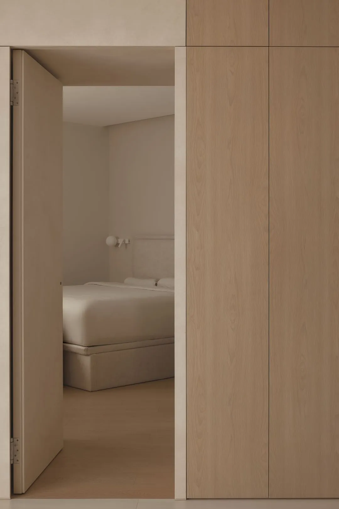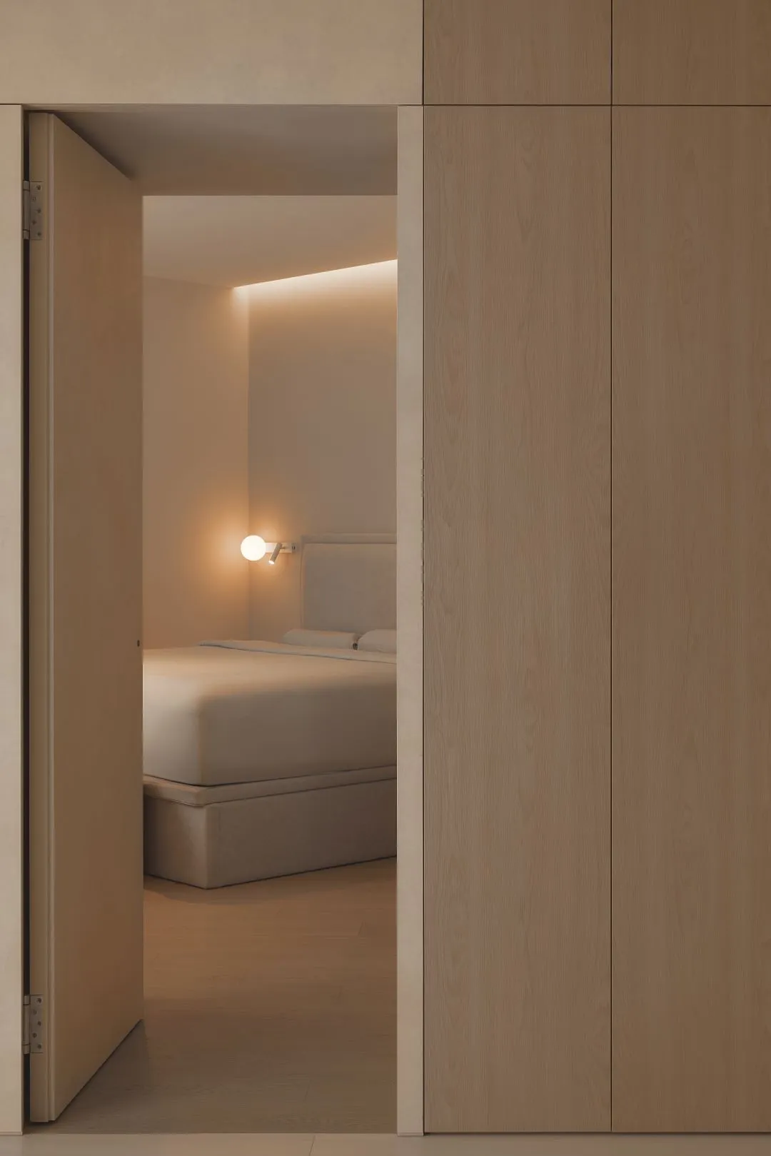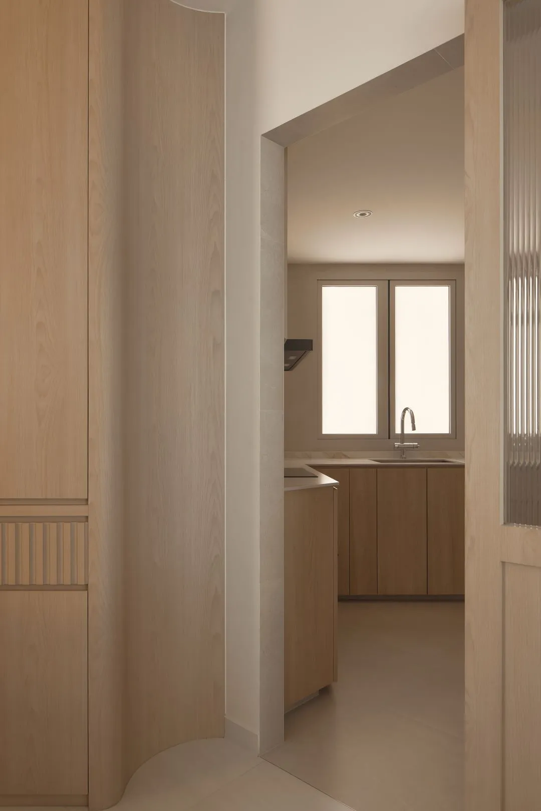 | Unique features | Curved Oak Joinery with Soft-Radius Detailing One of the most distinctive signatures of this project is the deliberate introduction of curved edges throughout the full-height oak cabinetry. Rather than the sharp, angular joinery common in contemporary Singapore interior design, the cabinetry at Prinsep Link transitions between walls and panels with gently radiused corners — a subtle but profoundly humanising touch that softens the entire spatial experience. Dual-Mood Lighting Architecture The home has been meticulously designed to live beautifully in two distinct lighting states. By day, spaces are bright and airy, anchored by natural oak and neutral stone tones. By night, a layered system of warm LED cove lighting, under-shelf strip lights, and sculptural pendant and wall-mounted fixtures transforms the same spaces into something altogether more intimate and enveloping. The dining and bar nook, in particular, shifts dramatically between these two moods — a feature best appreciated in the day-to-night photography of the project. Reeded Glass Pivot Door Framing the transition between the living and dining zones, a custom timber-framed door with reeded glass panel serves as both a functional space divider and a sculptural centrepiece. The vertical ribbing of the glass diffuses light and sight lines beautifully, maintaining a sense of openness while adding visual rhythm and architectural texture to the interior. Fluted Timber Cabinetry Panels Across the living room joinery, fluted vertical detailing is applied to select cabinet faces — a refined material accent that introduces depth and tactility without resorting to excessive ornamentation. This detail echoes the reeded glass of the pivot door, creating a cohesive design language that runs throughout the home. Built-In Dry Bar & Display Niche Integrated seamlessly into the dining room joinery wall, a dedicated dry bar and display niche is framed in matching oak with a travertine-effect stone backsplash. Complete with open shelving for curated objects and a touch-on sensor tap, this feature elevates the dining experience beyond the everyday — making even a quiet weeknight dinner feel considered and special. Floor-to-Ceiling Sand-Tone Wardrobe The master bedroom wardrobe is a masterclass in visual restraint. Finished in a warm sand-tone laminate with hairline-thin vertical recessed handles, the full-height configuration maximises storage while disappearing gracefully into the room — its barely-there presence allowing the soft, hotel-like atmosphere of the bedroom to breathe. Spa-Inspired Master Bathroom with Soaking Tub The master bathroom is a private retreat unto itself. A freestanding soaking bathtub positioned before full-height windows invites natural light to fill the space, while textured linen-effect wall tiles add subtle visual warmth. Warm LED cove lighting crowns the room at ceiling level, transforming the bathroom after dark into a space that rivals the world's finest hotel suites. Consistent Vessel Basin + Oak Vanity Language Both bathrooms feature round vessel basins mounted on custom oak vanity units — a design decision that unifies the wet spaces with the broader material story of the home. Oak mirror cabinets with integrated open shelving complete each vanity zone, offering practical storage without sacrificing the calm, gallery-like quality of the bathrooms. |