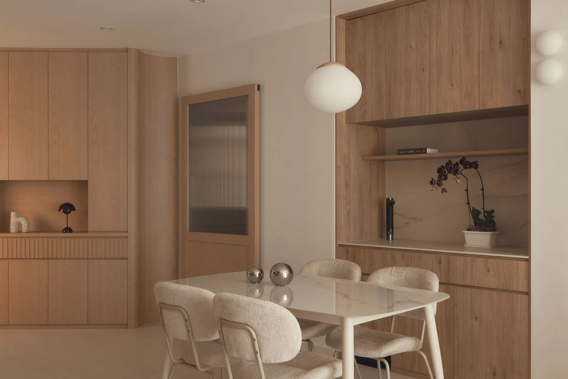 | Unique features | Curved Oak Joinery with Soft-Radius Detailing One of the most distinctive signatures of this project is the deliberate introduction of curved edges throughout the full-height oak cabinetry. Rather than the sharp, angular joinery common in contemporary Singapore interior design, the cabinetry at Prinsep Link transitions between walls and panels with gently radiused corners — a subtle but profoundly humanising touch that softens the entire spatial experience. Dual-Mood Lighting Architecture The home has been meticulously designed to live beautifully in two distinct lighting states. By day, spaces are bright and airy, anchored by natural oak and neutral stone tones. By night, a layered system of warm LED cove lighting, under-shelf strip lights, and sculptural pendant and wall-mounted fixtures transforms the same spaces into something altogether more intimate and enveloping. The dining and bar nook, in particular, shifts dramatically between these two moods — a feature best appreciated in the day-to-night photography of the project. Reeded Glass Pivot Door Framing the transition between the living and dining zones, a custom timber-framed door with reeded glass panel serves as both a functional space divider and a sculptural centrepiece. The vertical ribbing of the glass diffuses light and sight lines beautifully, maintaining a sense of openness while adding visual rhythm and architectural texture to the interior. Fluted Timber Cabinetry Panels Across the living room joinery, fluted vertical detailing is applied to select cabinet faces — a refined material accent that introduces depth and tactility without resorting to excessive ornamentation. This detail echoes the reeded glass of the pivot door, creating a cohesive design language that runs throughout the home. Built-In Dry Bar & Display Niche Integrated seamlessly into the dining room joinery wall, a dedicated dry bar and display niche is framed in matching oak with a travertine-effect stone backsplash. Complete with open shelving for curated objects and a touch-on sensor tap, this feature elevates the dining experience beyond the everyday — making even a quiet weeknight dinner feel considered and special. Floor-to-Ceiling Sand-Tone Wardrobe The master bedroom wardrobe is a masterclass in visual restraint. Finished in a warm sand-tone laminate with hairline-thin vertical recessed handles, the full-height configuration maximises storage while disappearing gracefully into the room — its barely-there presence allowing the soft, hotel-like atmosphere of the bedroom to breathe. Spa-Inspired Master Bathroom with Soaking Tub The master bathroom is a private retreat unto itself. A freestanding soaking bathtub positioned before full-height windows invites natural light to fill the space, while textured linen-effect wall tiles add subtle visual warmth. Warm LED cove lighting crowns the room at ceiling level, transforming the bathroom after dark into a space that rivals the world's finest hotel suites. Consistent Vessel Basin + Oak Vanity Language Both bathrooms feature round vessel basins mounted on custom oak vanity units — a design decision that unifies the wet spaces with the broader material story of the home. Oak mirror cabinets with integrated open shelving complete each vanity zone, offering practical storage without sacrificing the calm, gallery-like quality of the bathrooms. |