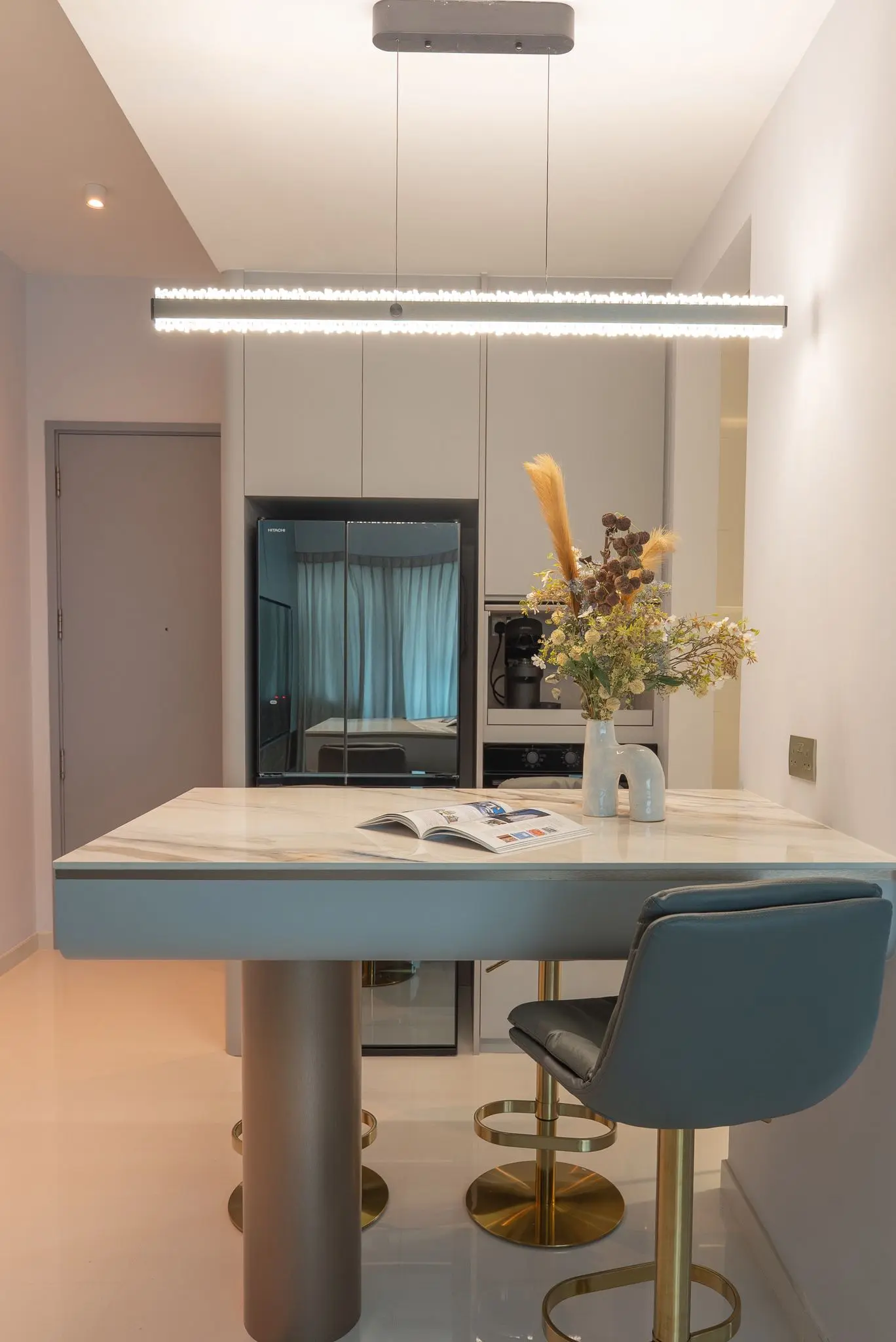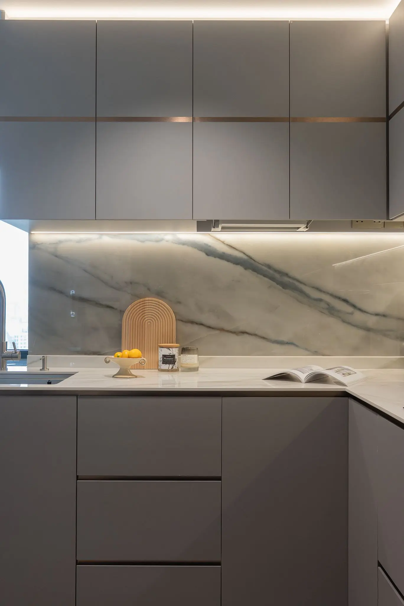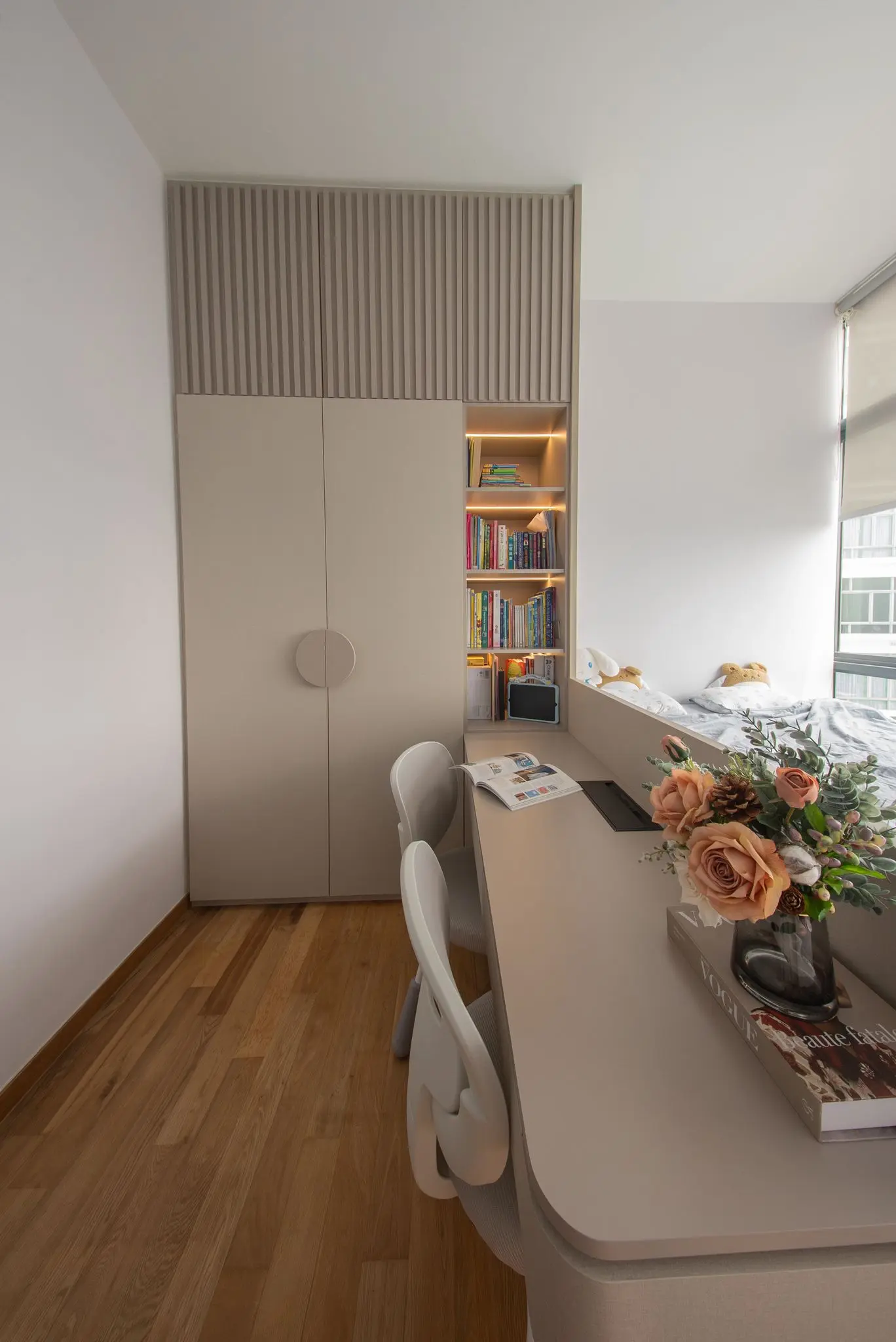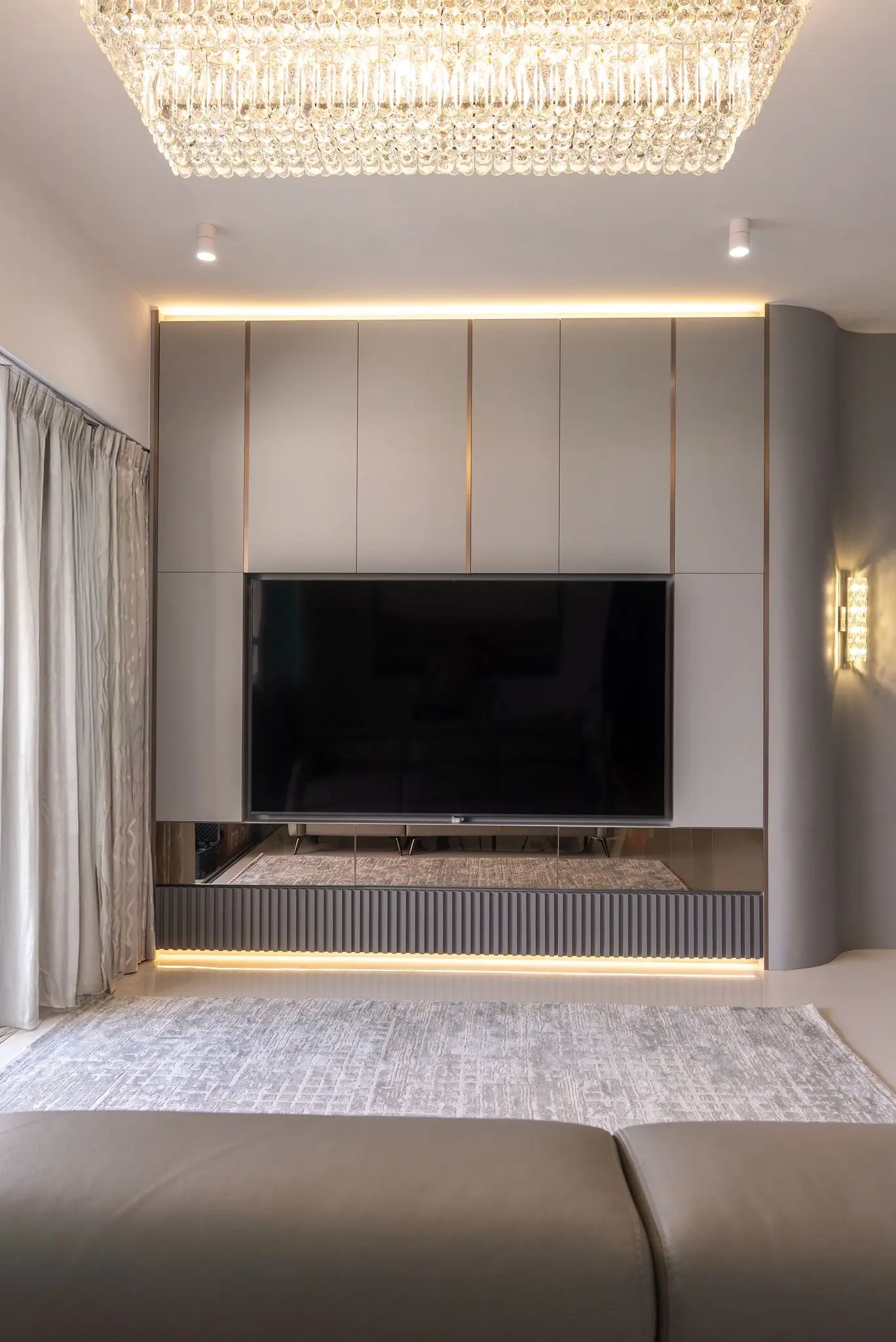 Unique features | A full-height TV feature wall integrates bronze trim, storage cabinetry, and soft lighting to form a central visual focus. The dry kitchen is clad in matte-finish cabinets paired with book-matched marble backsplash, anchored by a sculptural island with gold leg detailing. The kids' room features a custom-built platform bed with integrated steps, drawers, and a dual study desk—balancing function and playfulness. The bathroom blends moody stone surfaces with a sleek floating vanity and backlit mirror cabinet, elevating everyday rituals into spa-like moments. |
