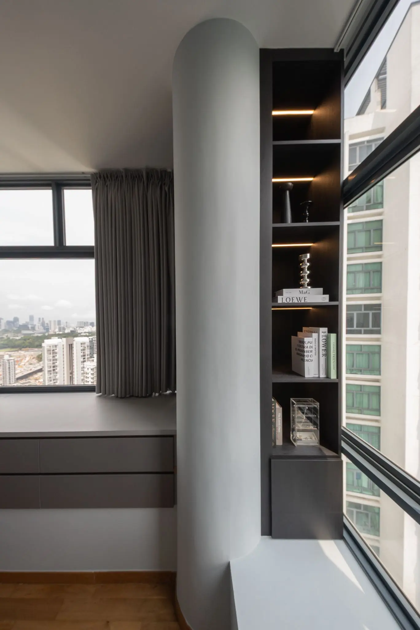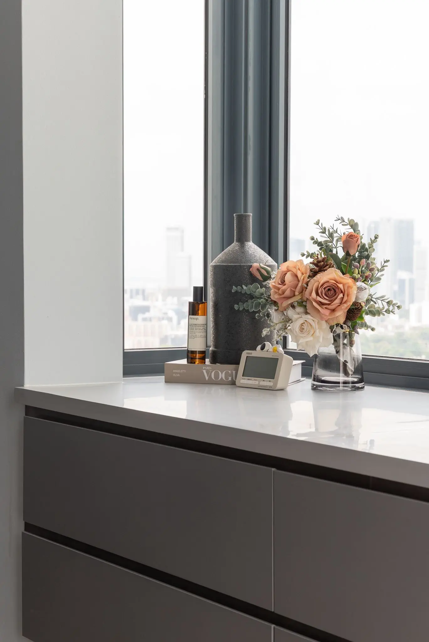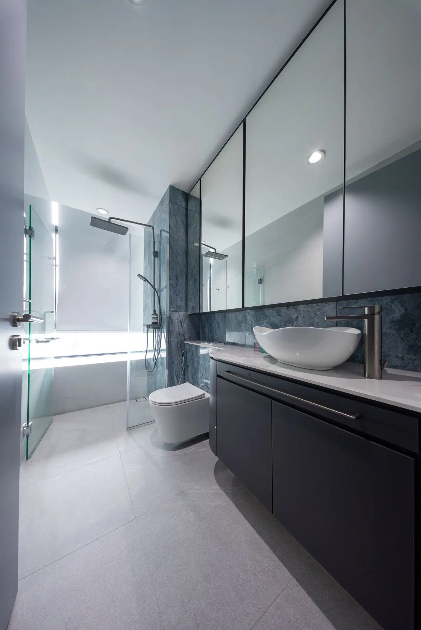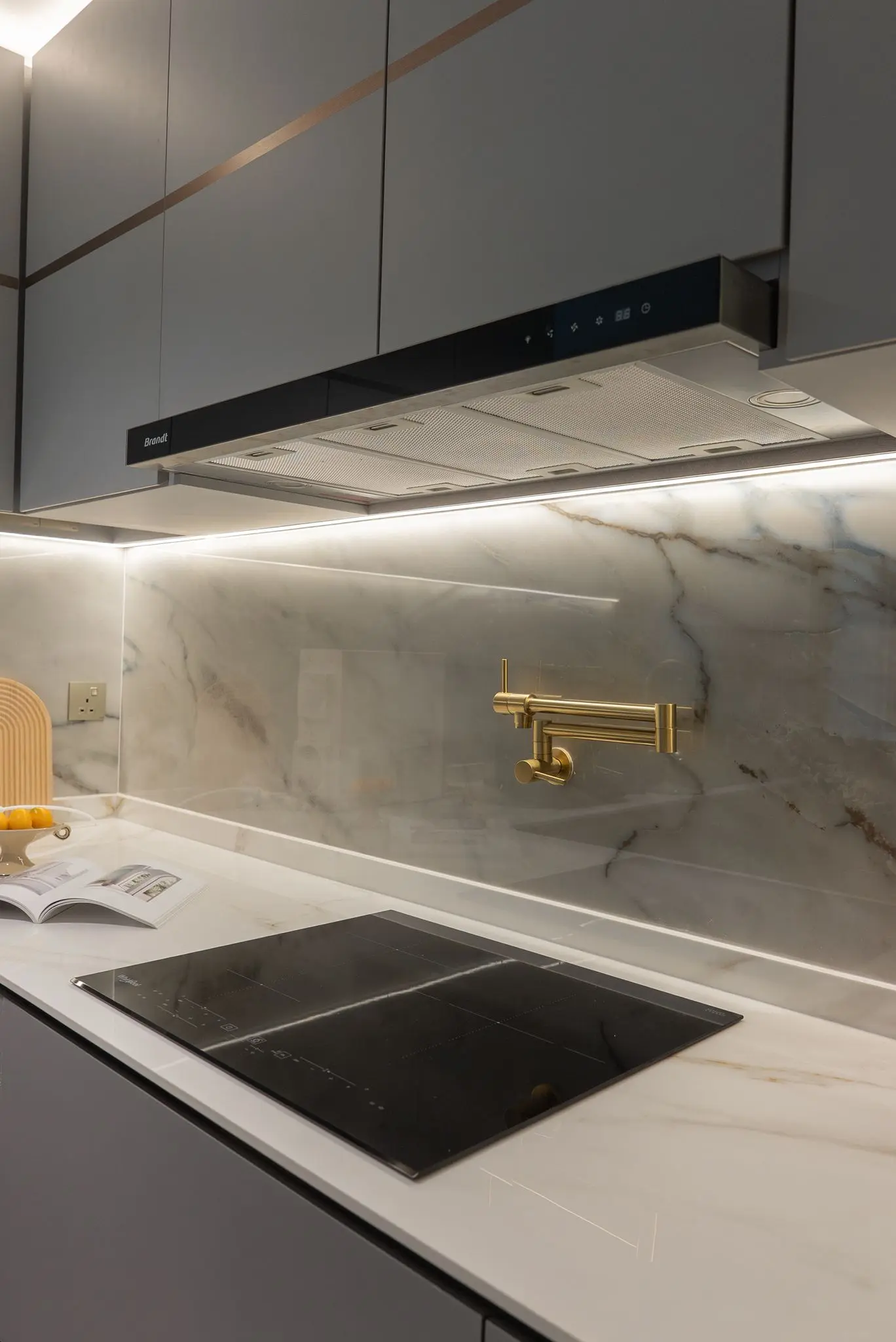 Unique features | A full-height TV feature wall integrates bronze trim, storage cabinetry, and soft lighting to form a central visual focus. The dry kitchen is clad in matte-finish cabinets paired with book-matched marble backsplash, anchored by a sculptural island with gold leg detailing. The kids' room features a custom-built platform bed with integrated steps, drawers, and a dual study desk—balancing function and playfulness. The bathroom blends moody stone surfaces with a sleek floating vanity and backlit mirror cabinet, elevating everyday rituals into spa-like moments. |