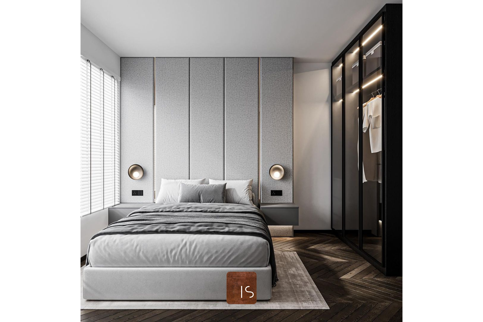 Design Concept | Modern Minimalist | The design concept of Trivelis DBSS is centered around modern minimalism, emphasizing functional luxury. Each space within the unit is crafted with the intent to evoke a sense of tranquility and order. The color palette is carefully curated, predominantly featuring neutral shades that bring about an expansive and calming environment. This is complemented by strategic lighting that highlights the sleek lines and textures of the furniture and finishes. The use of natural wood in herringbone patterns for the flooring, alongside the padded textile headboard in the bedroom, introduces organic textures that break the monotony and add warmth to the spaces. The design leverages clean, uncluttered lines and a blend of matte and reflective surfaces to create a dynamic yet cohesive aesthetic across the home.