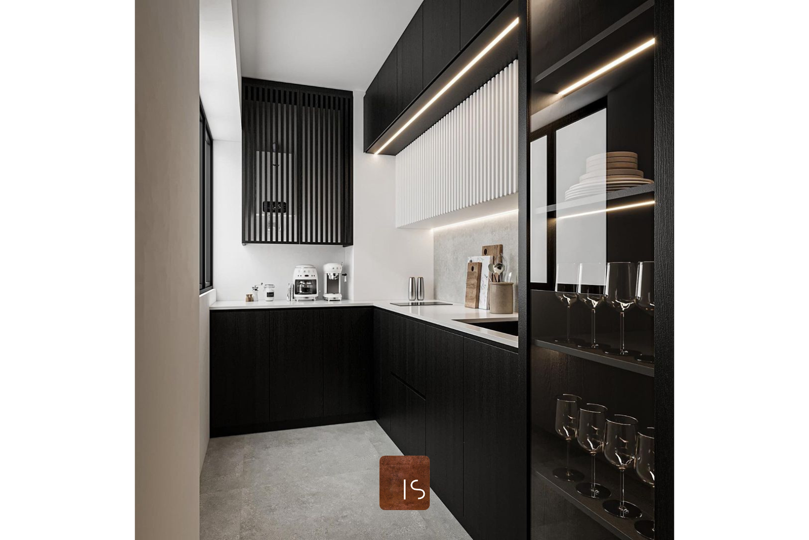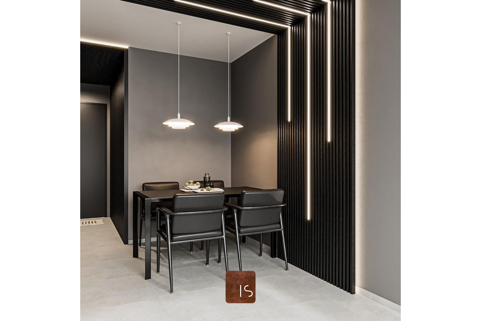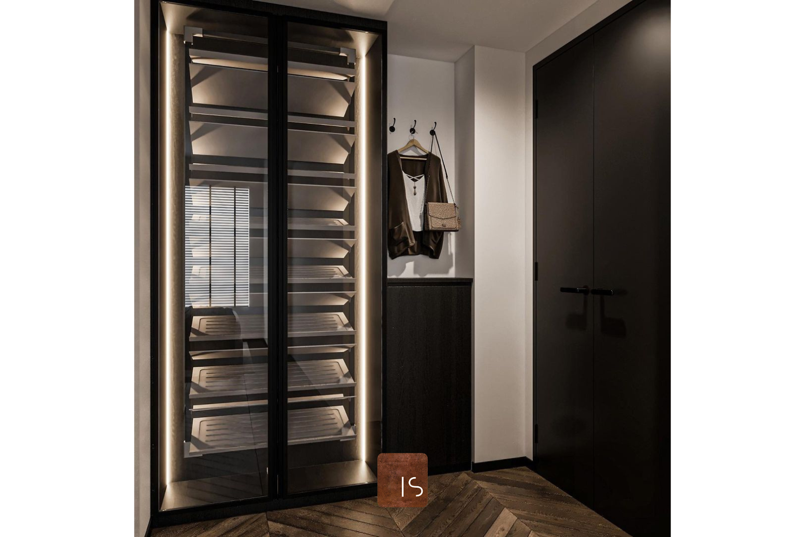 Unique features | The Trivelis DBSS project's unique feature is the integration of custom-built, illuminated storage solutions that combine functionality with a display-like aesthetic. In the bedroom, the wardrobe extends into a full-height feature that not only serves as a practical space for organization but also acts as a display for select clothing items, elevating them to the status of art within the room's context. In the kitchenette, the under-cabinet lighting not only enhances functionality by illuminating workspaces but also creates a soft ambiance that highlights the sleekness of the modern cabinetry. These illuminated storage solutions become a focal point in each space, marrying practicality with the luxury of design. |